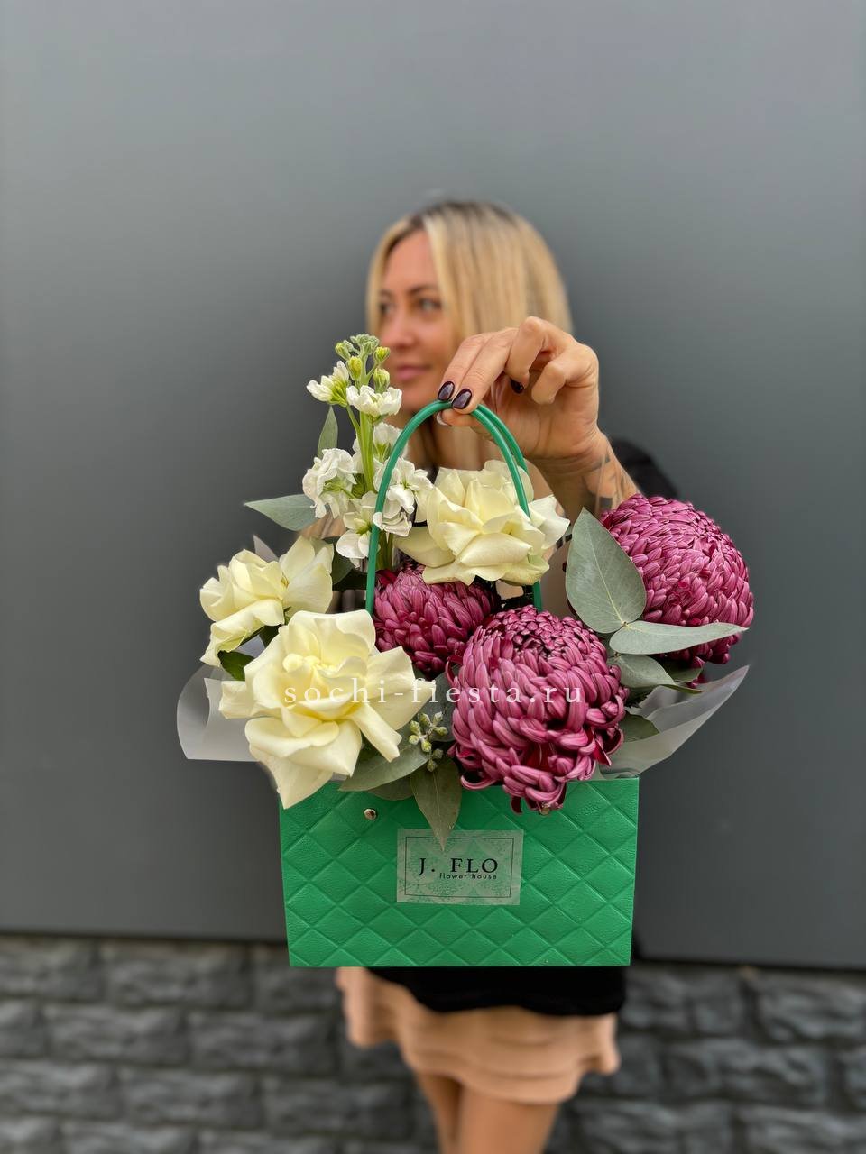 хризантемы бигуди, маттиола, розы,  эвкалипт, сумка.