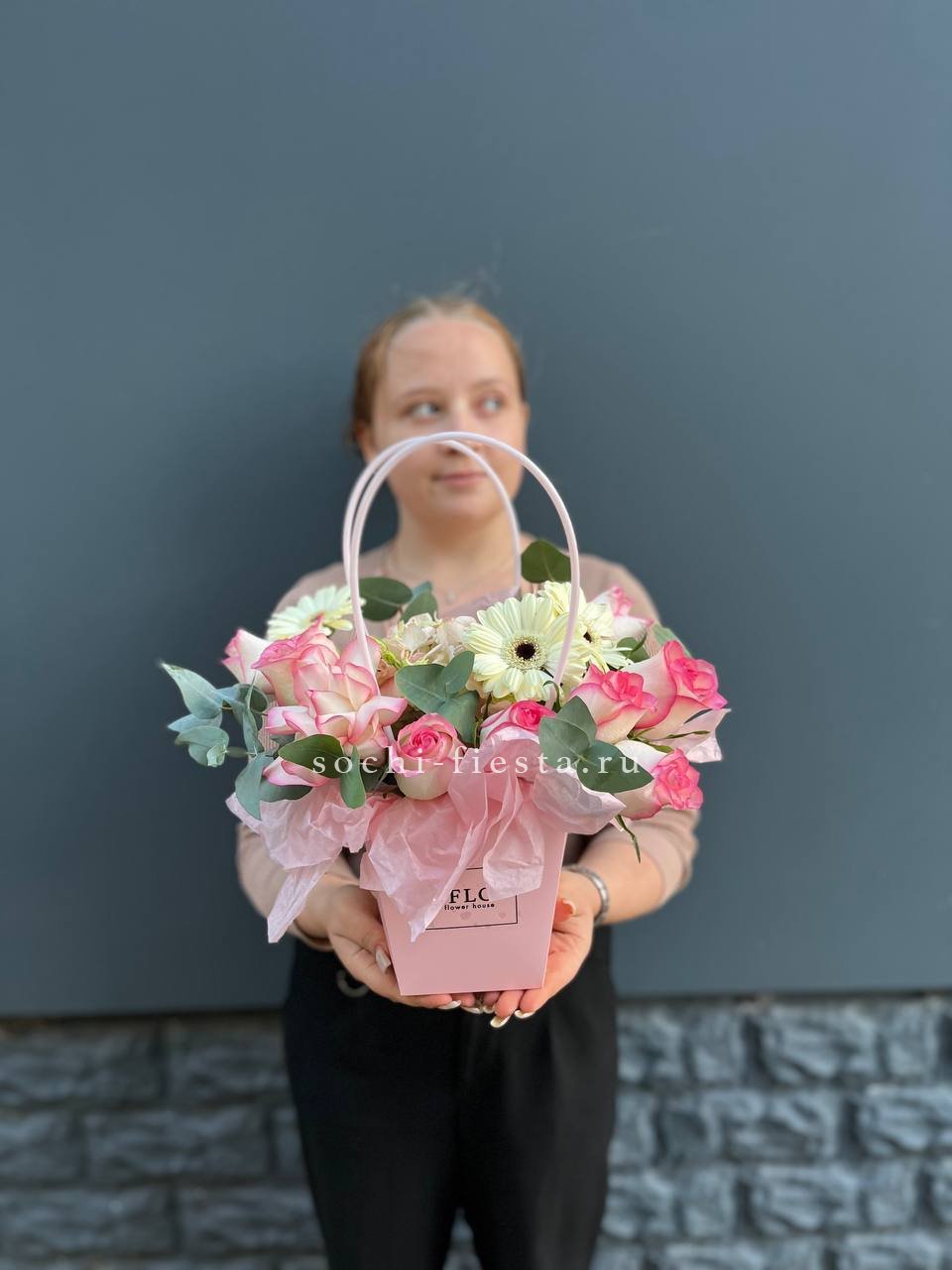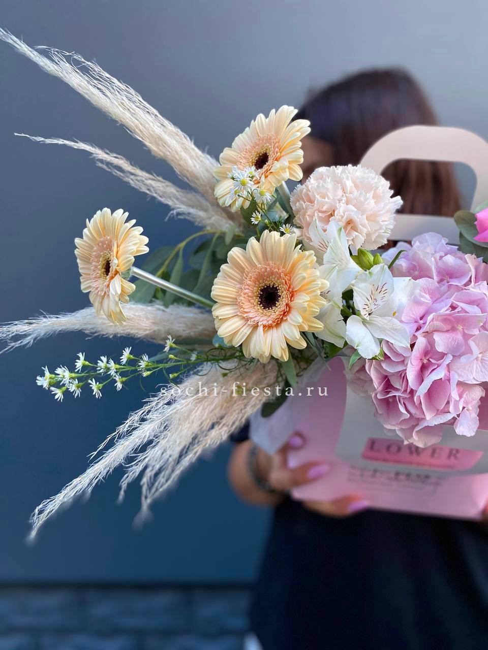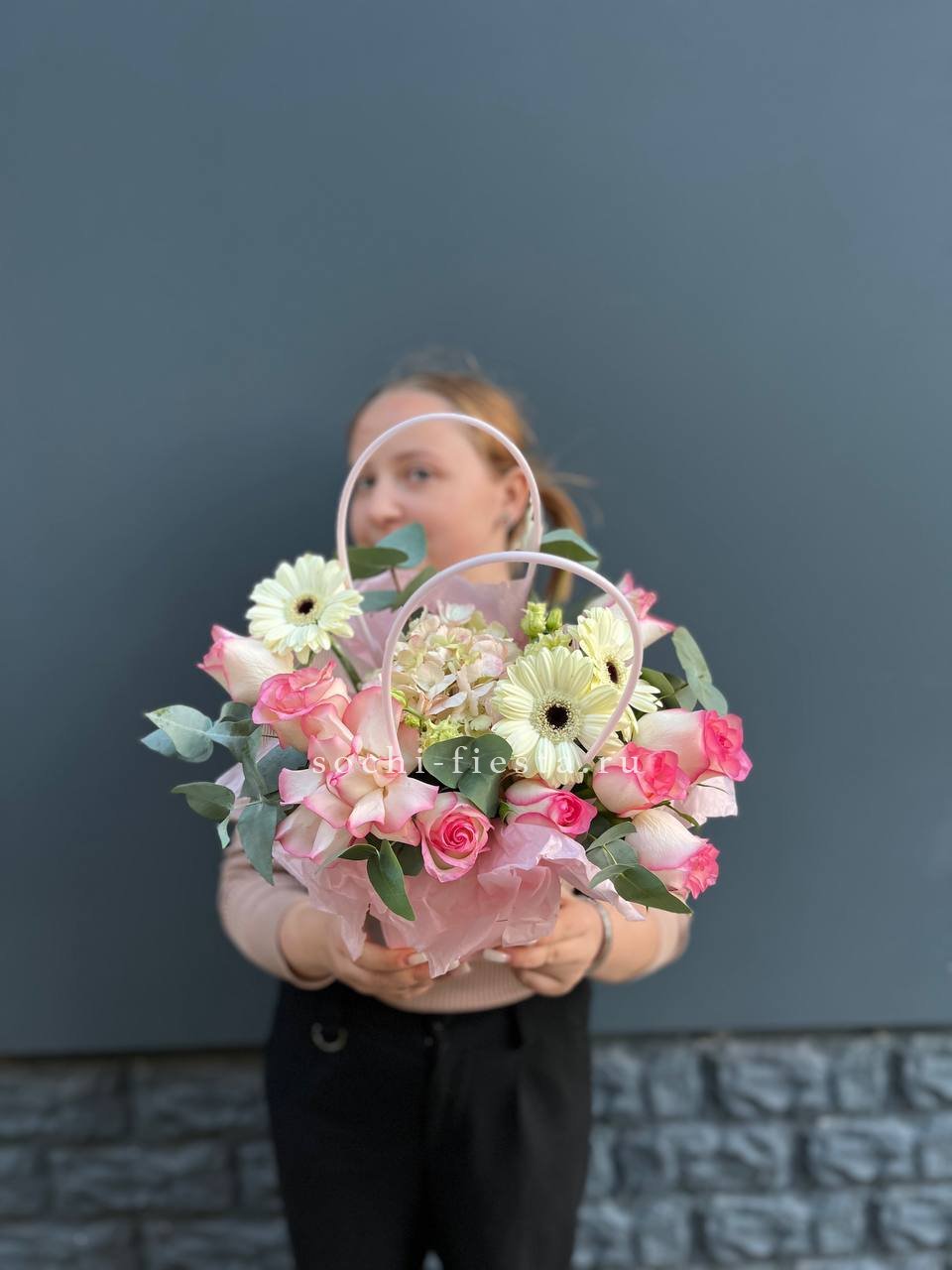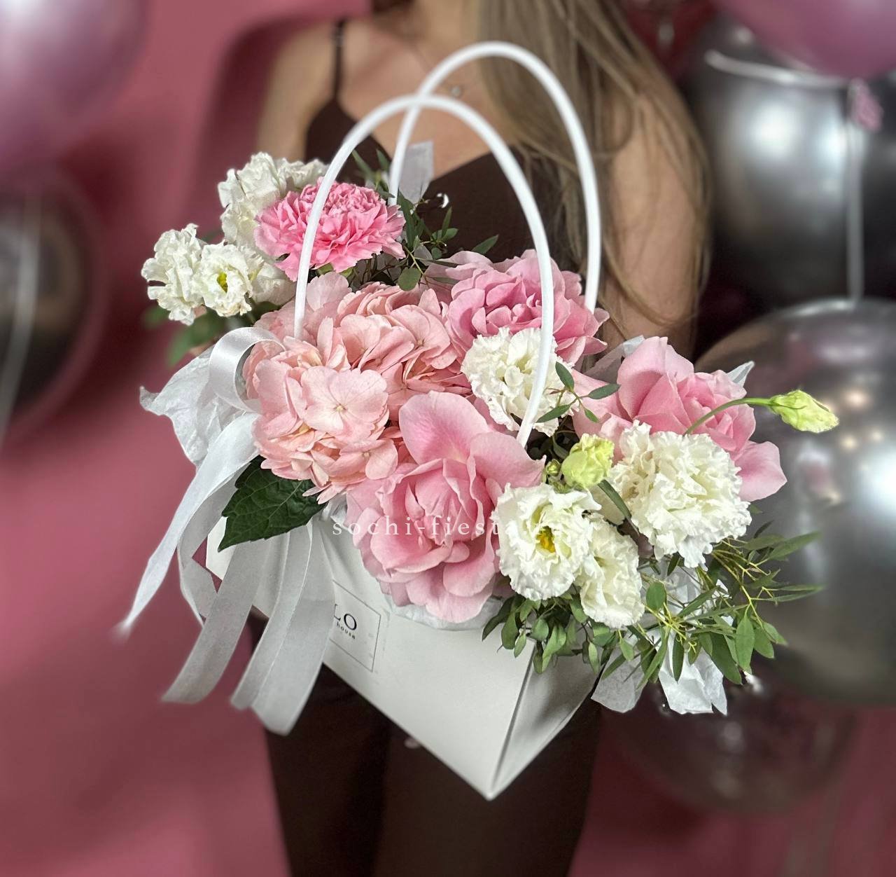 гортензия, розовые розы, эустома, диантусы,эвкалипт, лента, сумка-кашпо.