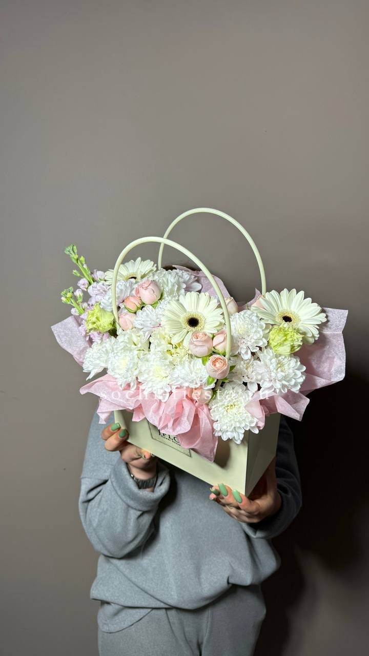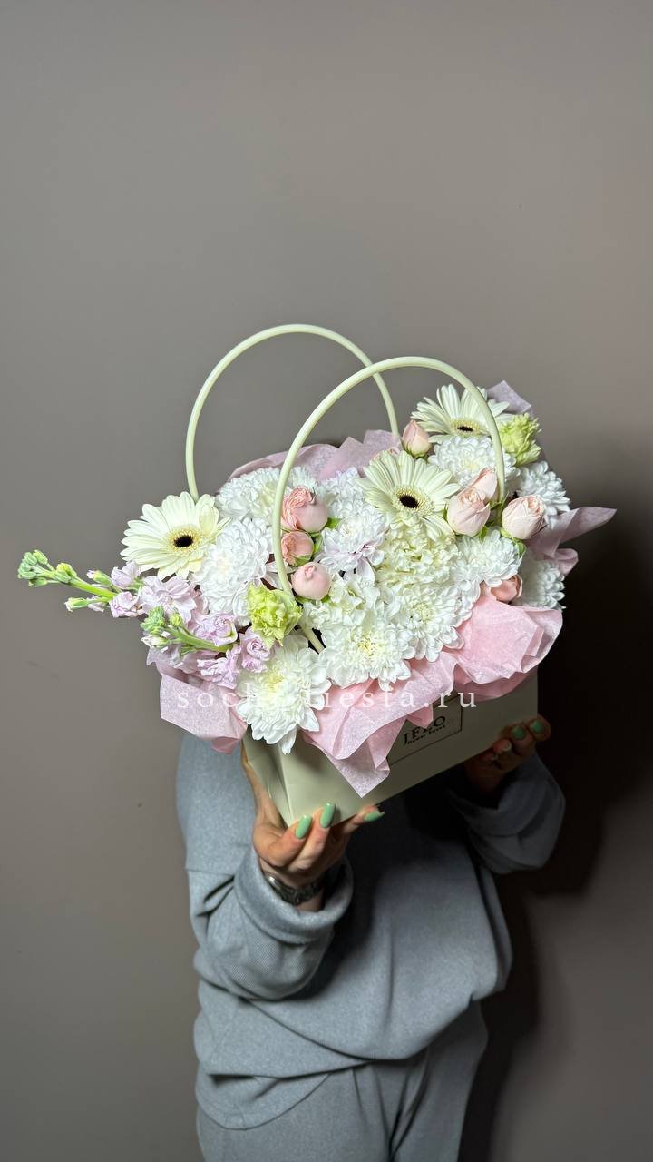 Хризантемы и львиный зев собраны в удобную сумочку с плотной структурой. Лимониум добавляет воздушности между яркими соцветиями. Композиция сохраняет свежесть долго и не требует особого ухода.