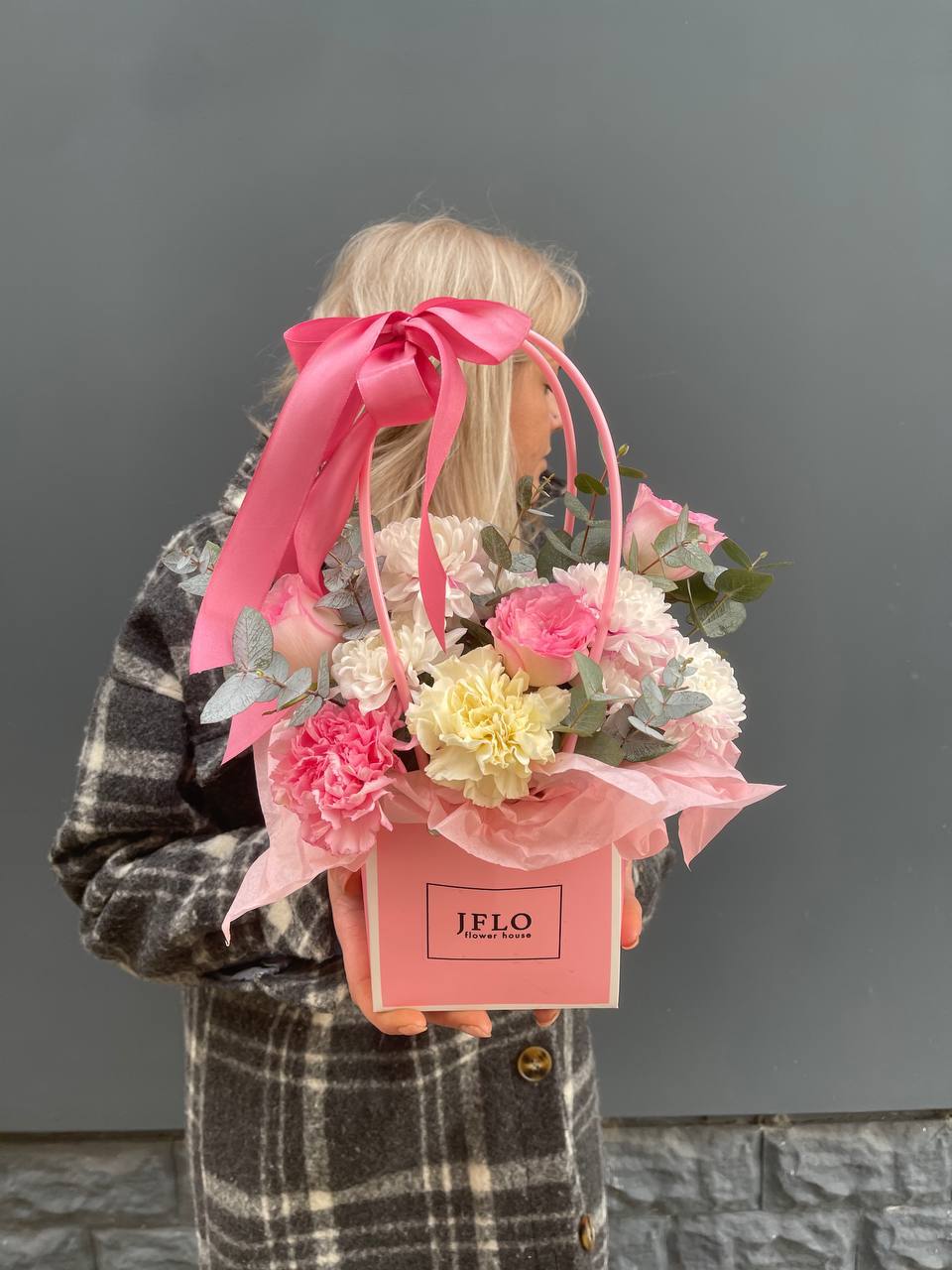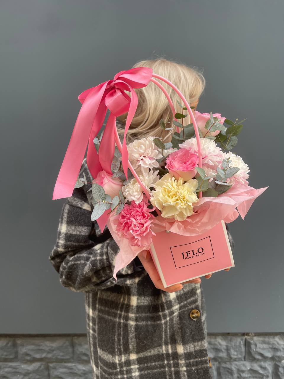 Хризантемы и диантус в удобной сумочке держат форму долго и выглядят свежо несколько дней. Лагурус добавляет текстуры, а эвкалипт дополняет композицию природной естественностью.
