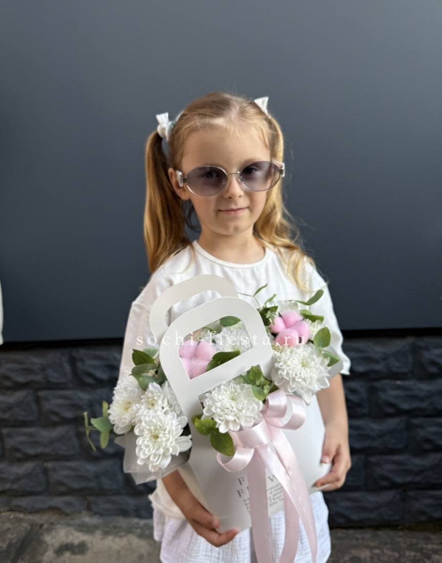 Хризантемы с пушистыми коробочками хлопка создают теплую домашнюю композицию в удобной сумочке. Цветы долго радуют взгляд и не требуют сложного ухода. Формат подходит для размещения в любом уголке дома.