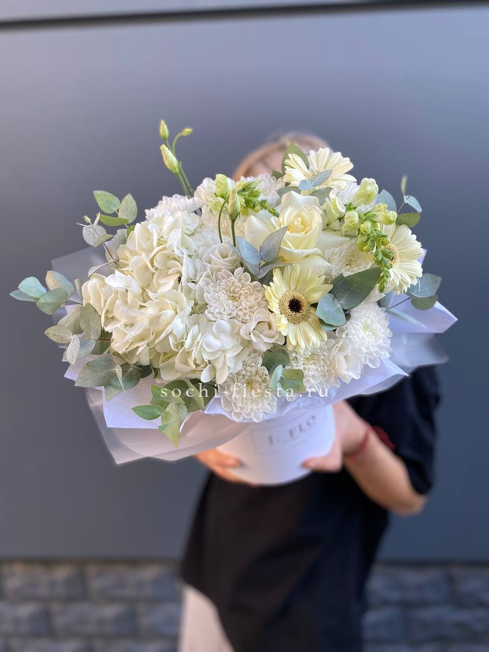 Пышная композиция в округлом боксе собрана из соцветий разной формы и ритма. Гортензия создает объемную базу, герберы и розы задают яркие точки, а эустома добавляет воздушности.