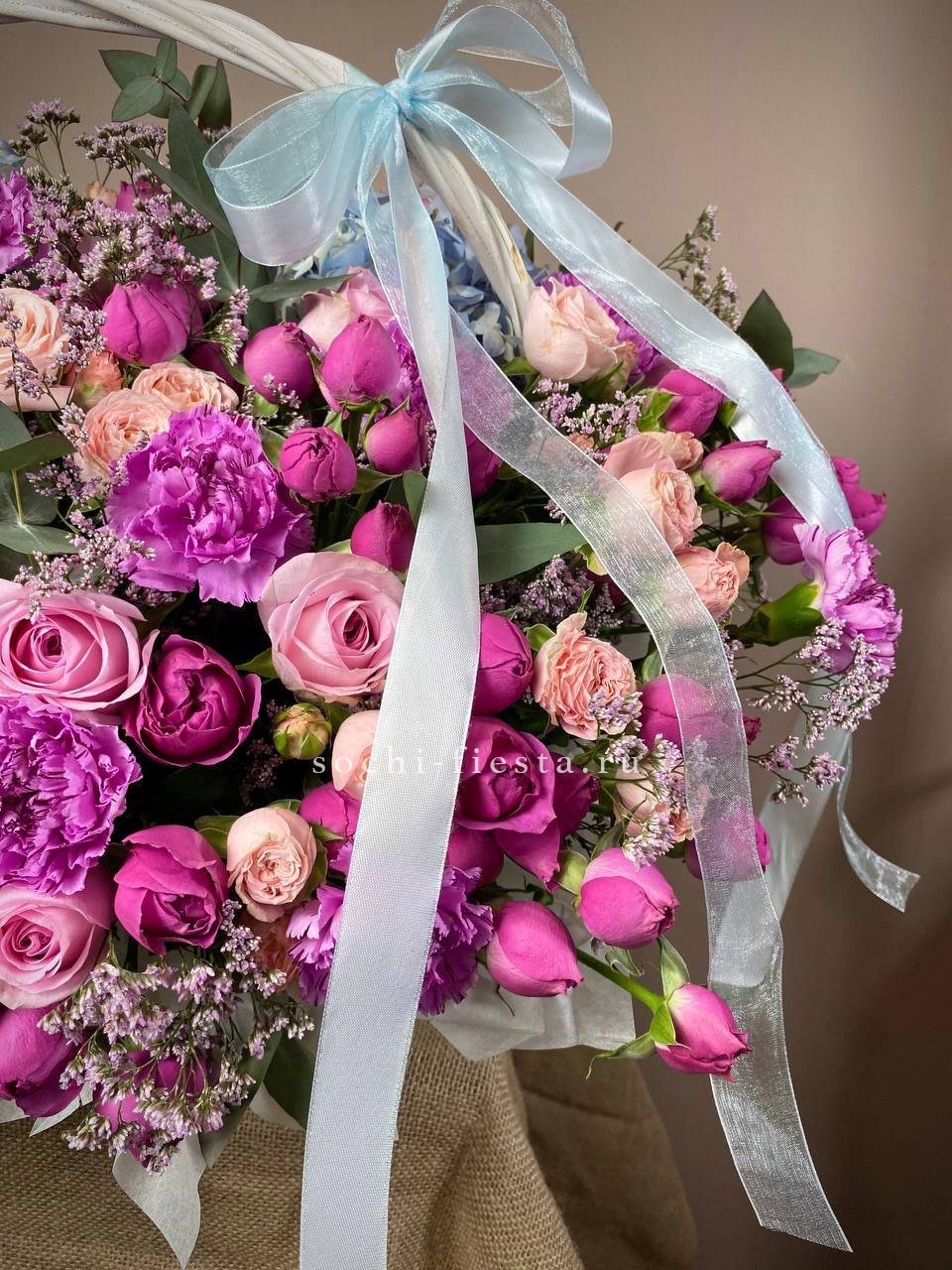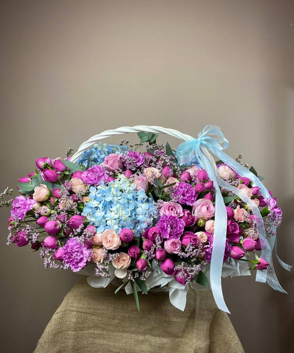 гортензия, диантус, розовая роза, эустома, гербера, корзина средняя, наполнение.