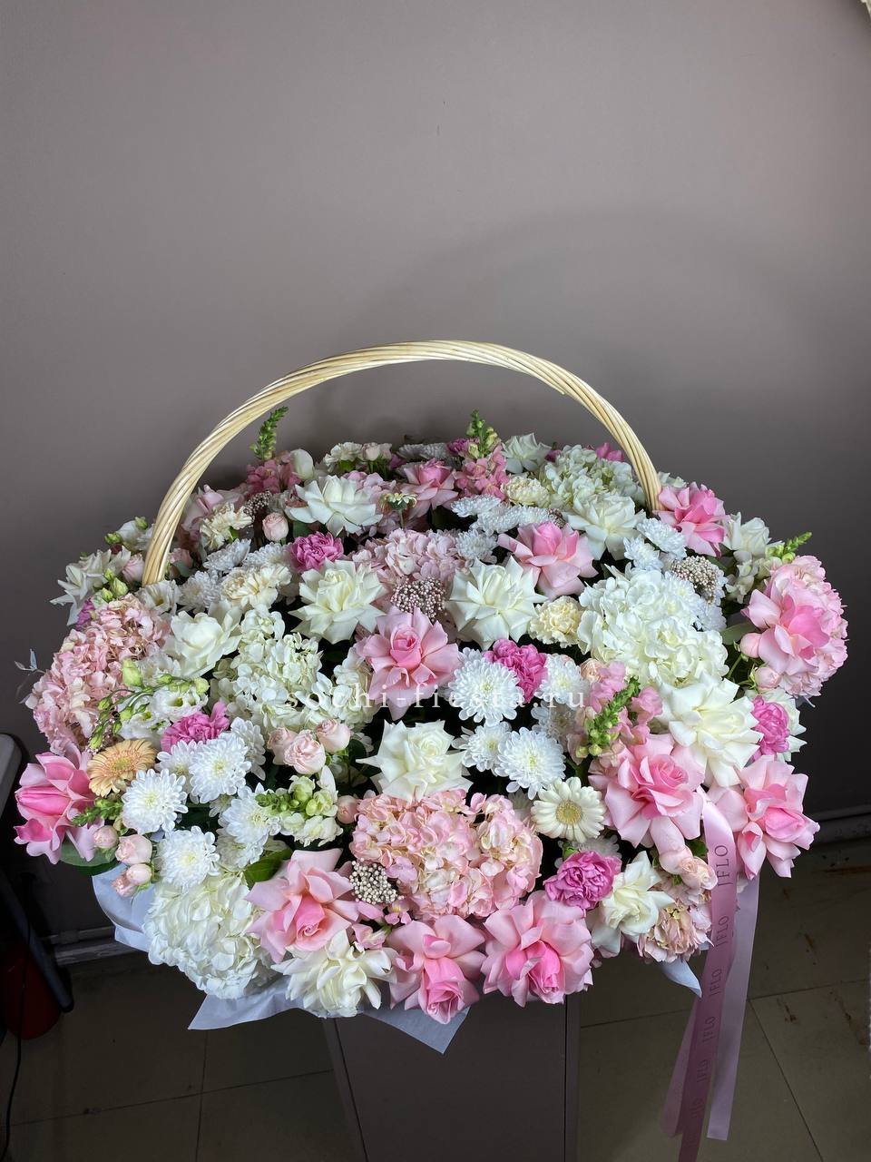 кустовые розы, одноголовые розы, диантусы,  гортензия, эустома, антиринум, озатамус, хризантема, герберы, лента, светлая корзина.Состав может меняться в зависимости от сезонности.