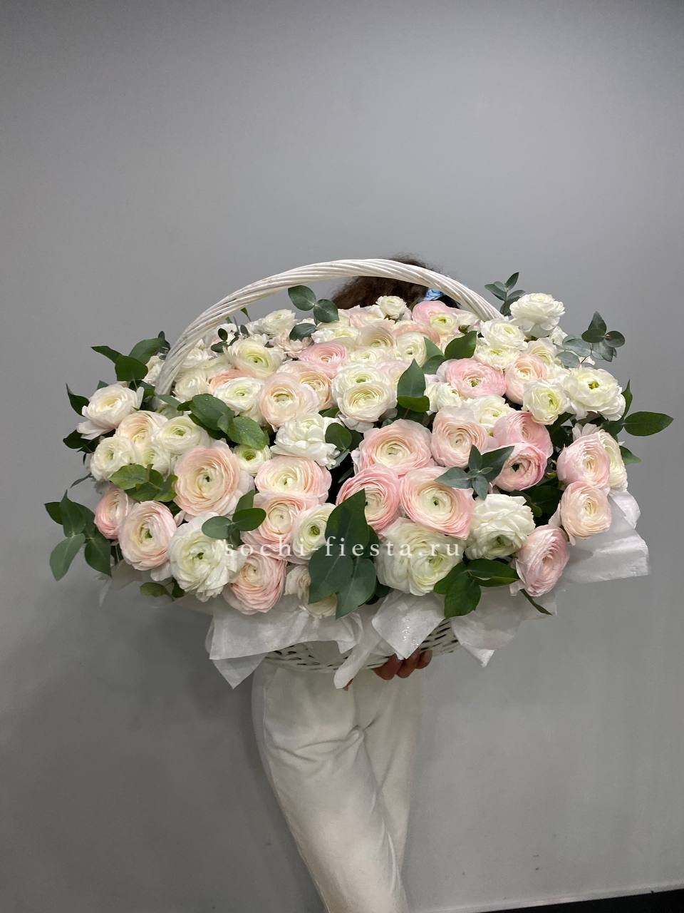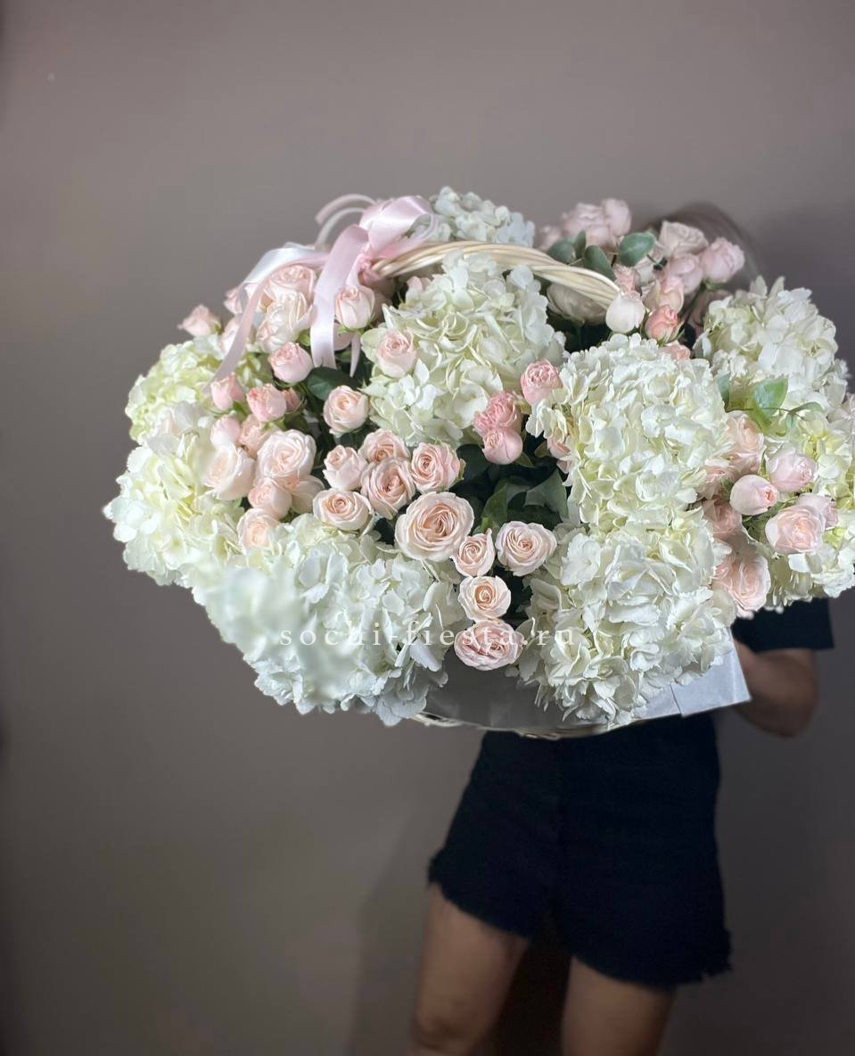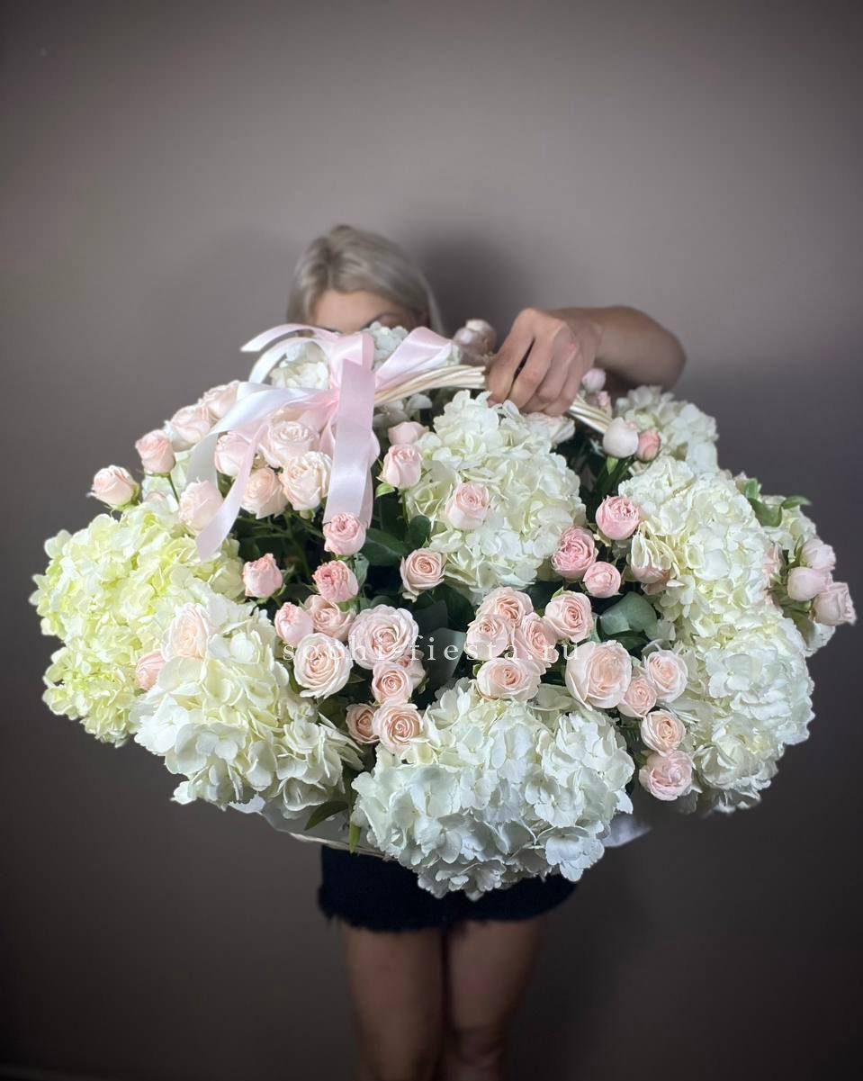 Корзина объединяет гортензии, эустомы, розы и маттиолу в многослойную композицию. Разные фактуры лепестков создают визуальную глубину и насыщенность.