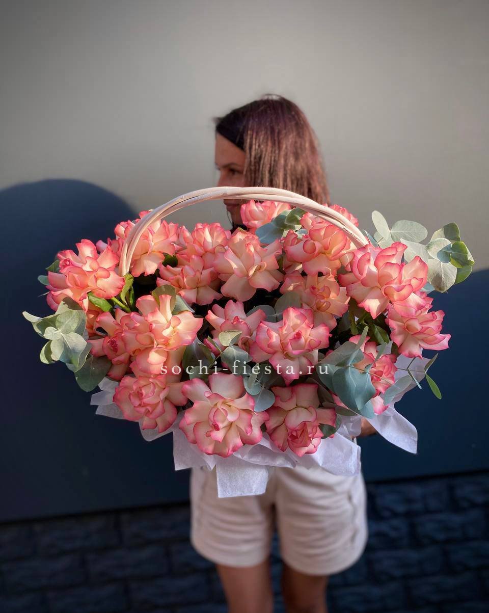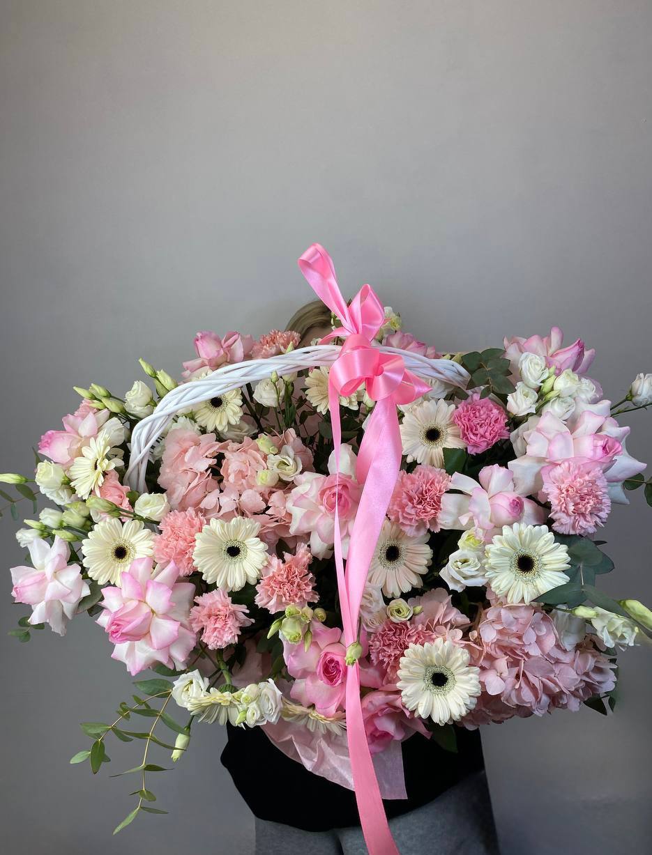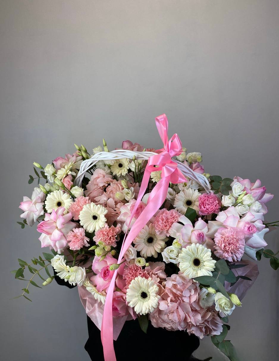 цветочная корзина с розами, мисти баблс, диантусами и гортензией.