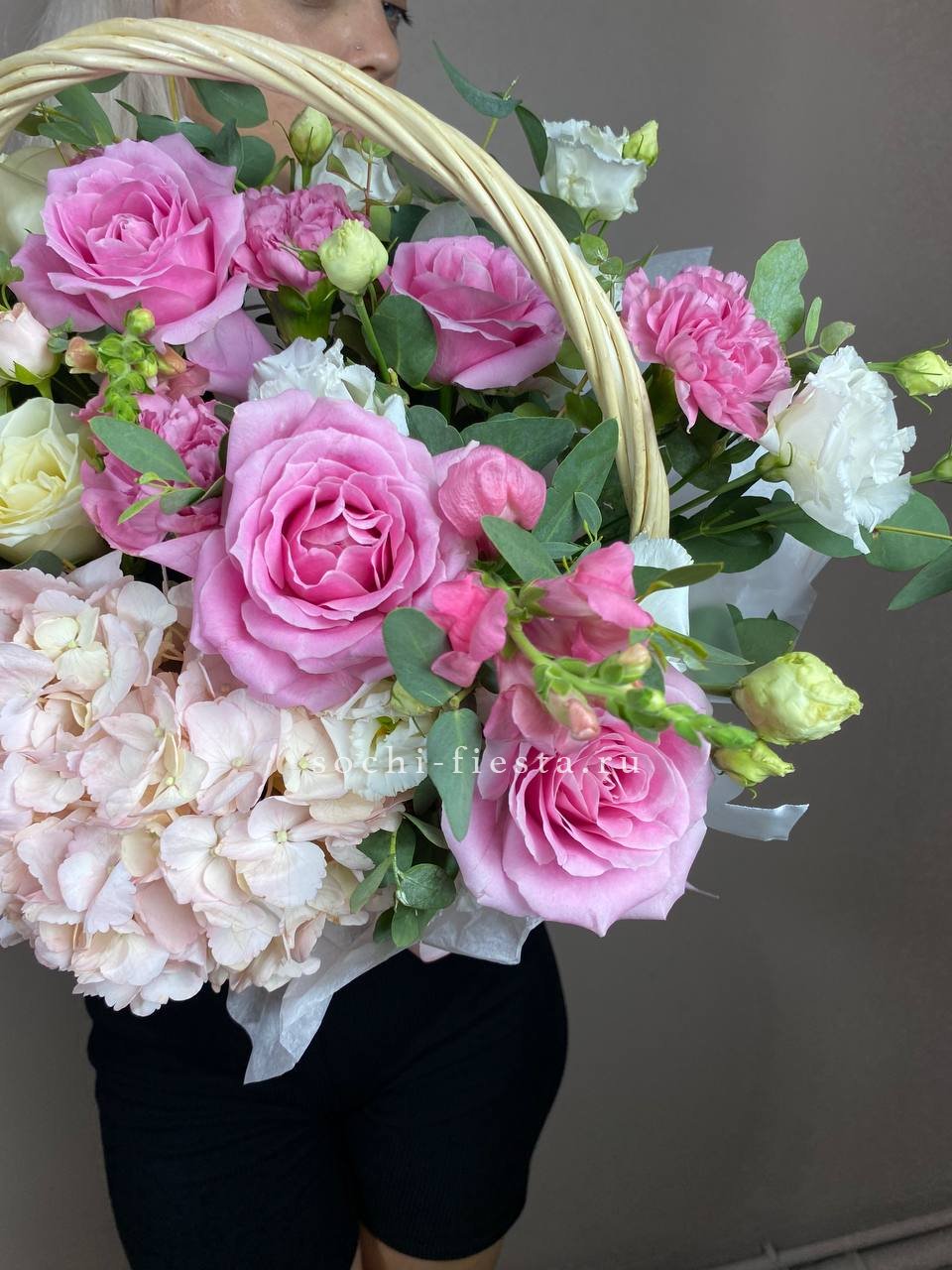 гортензия нежно-розовых оттенков, эустома, пионовидная кустовая роза, эвкалипт, диантус, антиринум, розы, лента, корзина.