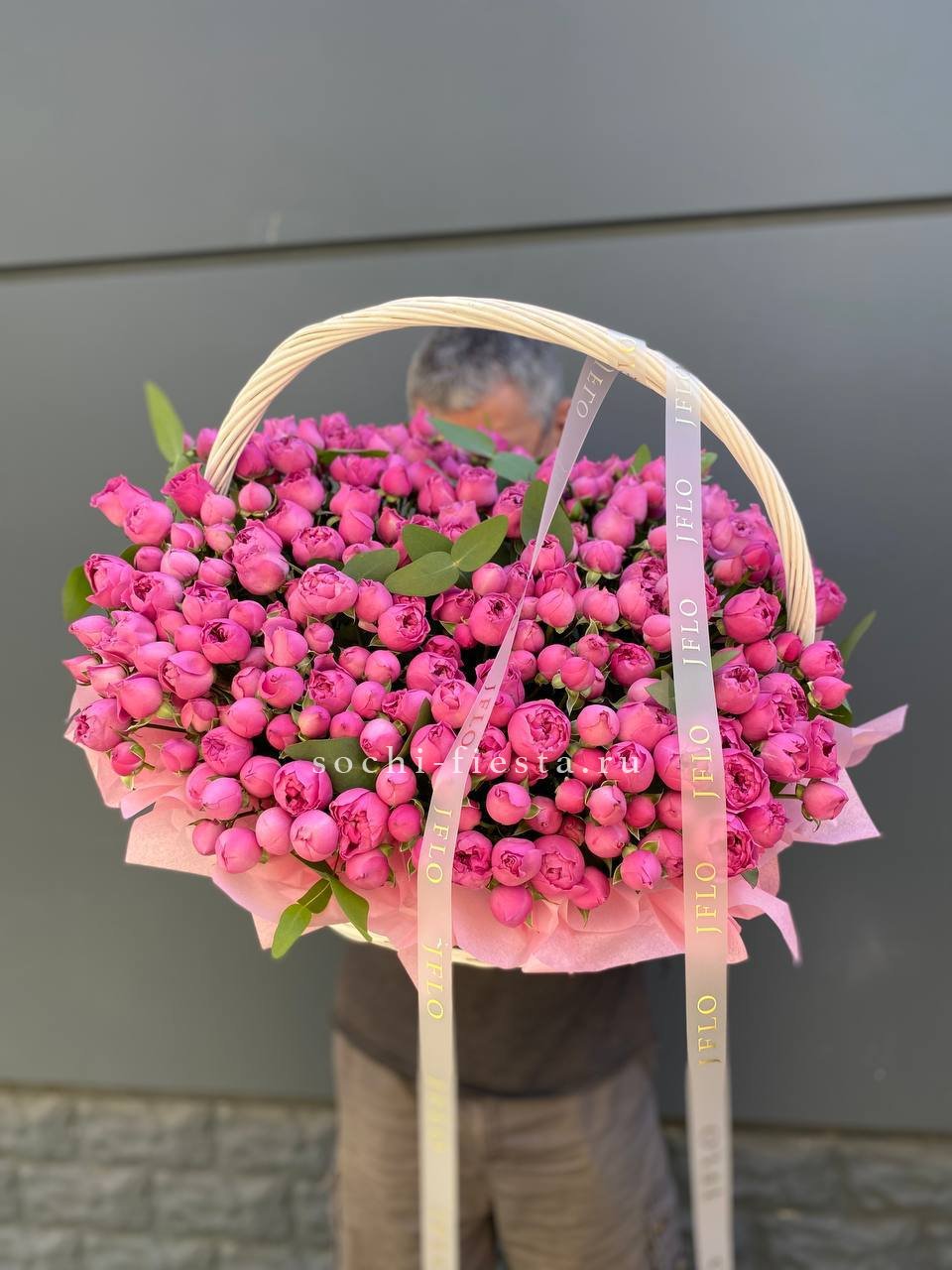 орхидея, гортензия, эустома, роза, эвкалипт, альстромерия, лента, корзина.