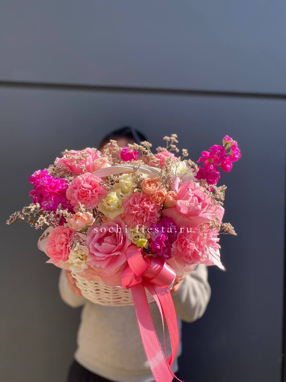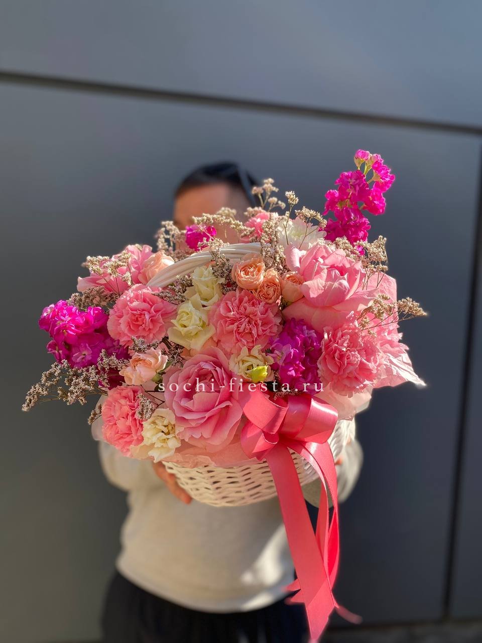 Плотная сферическая форма из пышных бутонов создаёт объёмную композицию в плетёной корзине. Ветки эвкалипта добавляют воздушности между головками цветов. Классическое решение для яркого события или знакового дня в жизни близкого человека.