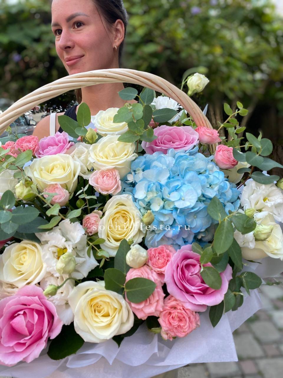 лилии, гортензия, антиринум, мисти баблс, розы, эустома, корзина гигант.
