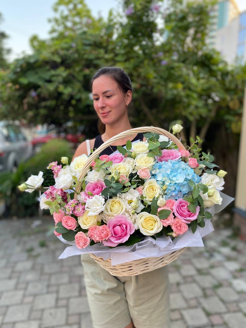 Масштабная корзина объединяет лилии, гортензии, антиринум, розы и эустому в единую объёмную композицию. Высота и насыщенность каждого слоя создают впечатление цветочного изобилия.