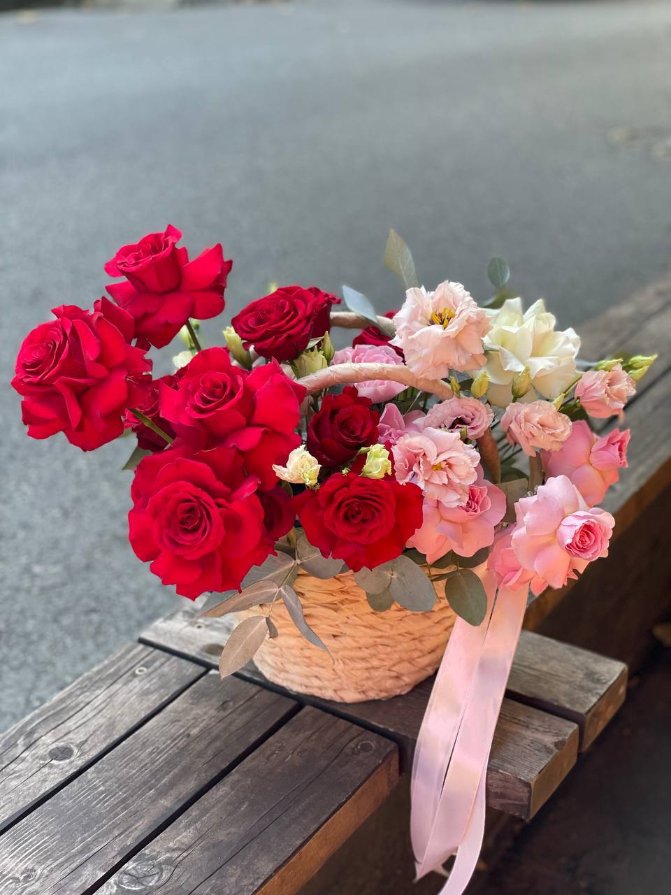 Гортензия и эустома задают объём, а яркие герберы расставляют цветовые акценты по всей композиции. Диантус и хайди добавляют воздушности, эвкалипт завершает силуэт мягкими линиями. Корзина держит форму и создаёт устойчивую основу для пышной композиции.