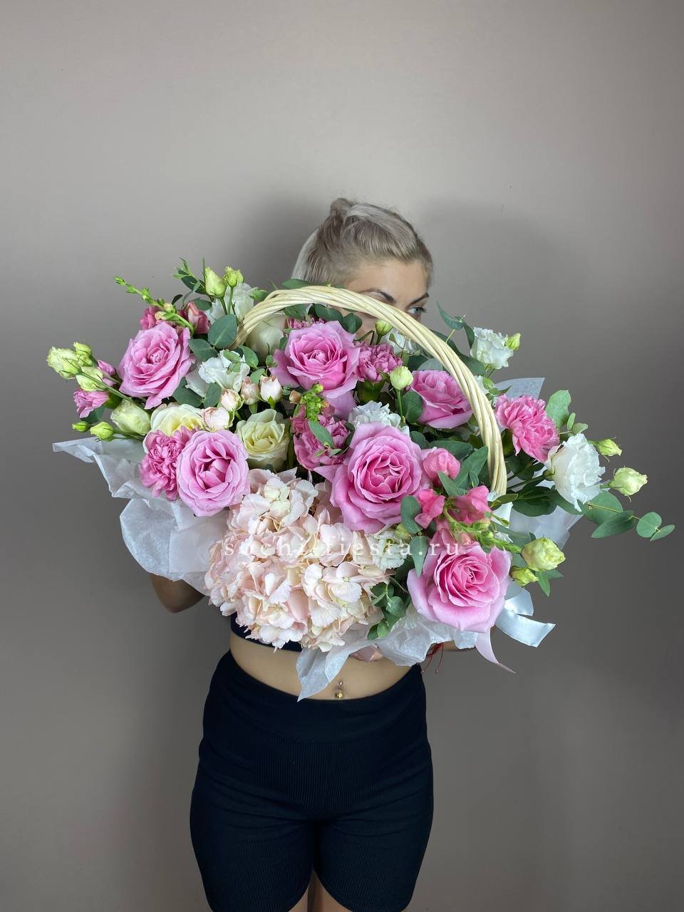 Плетеная корзина вмещает густую композицию из лилий с добавлением эвкалипта. Объемная форма создает впечатление цветущего сада, собранного в одном месте.