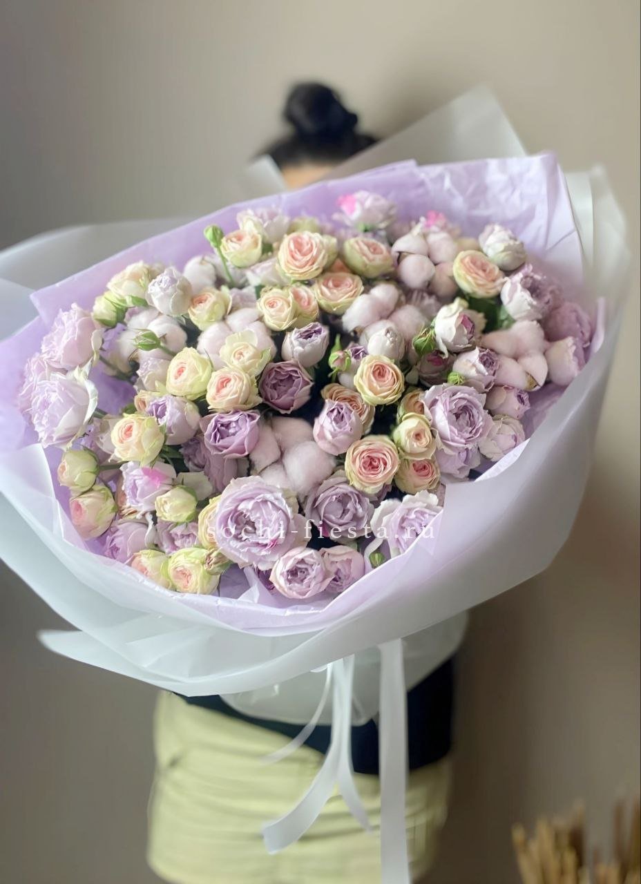Пятьдесят один бутон Мисти Баблс собраны в плетёную корзину и образуют плотную цветущую полусферу. Лавандовые оттенки раскрываются постепенно и держат форму долго.