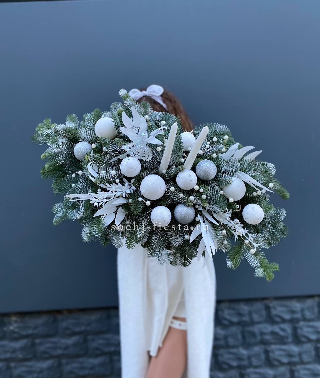 Низкая композиция с нобилисом и свечами создаёт камерное настроение вечера. Балерина добавляет лёгкости среди плотной хвои и блестящих игрушек.