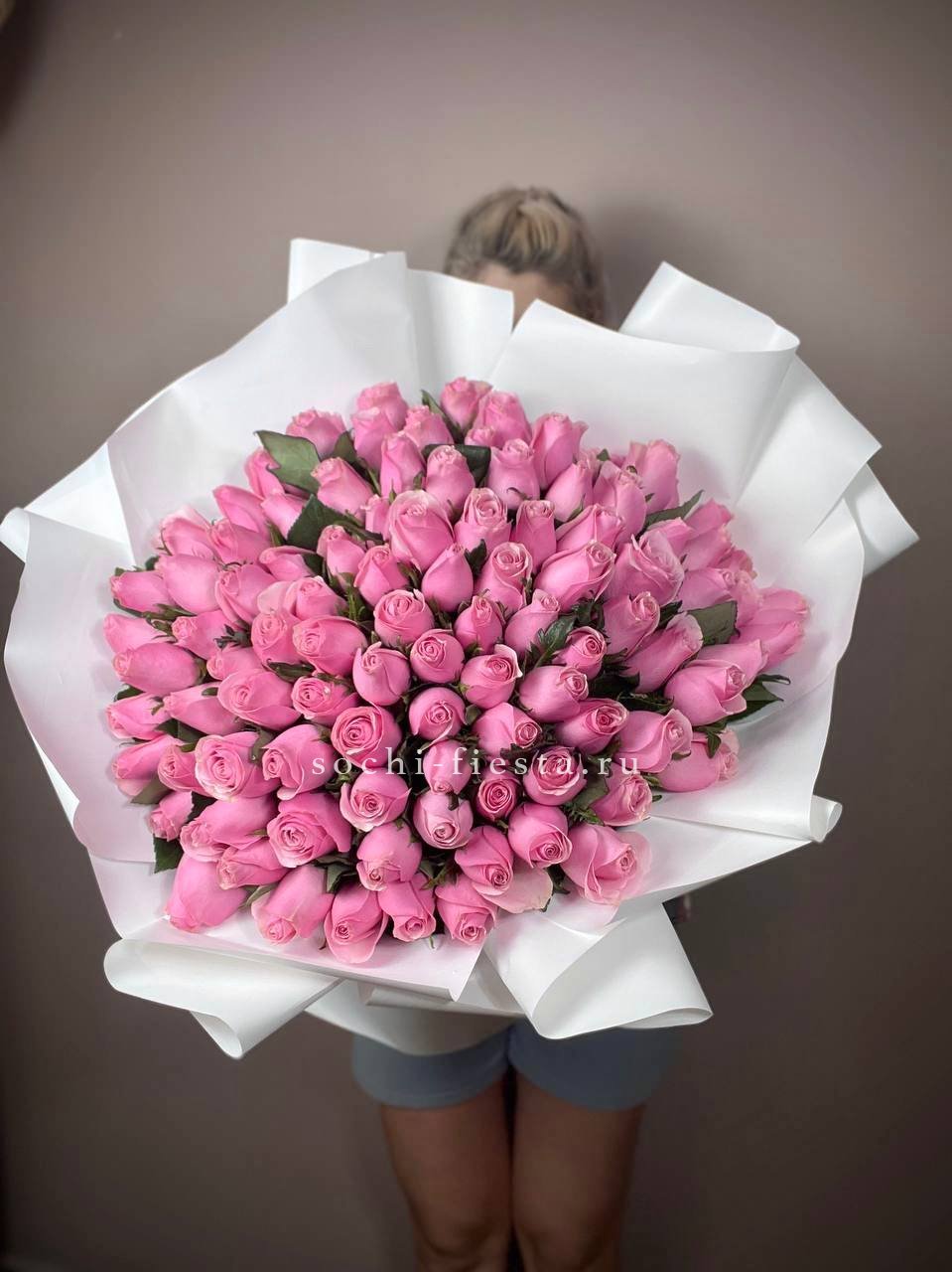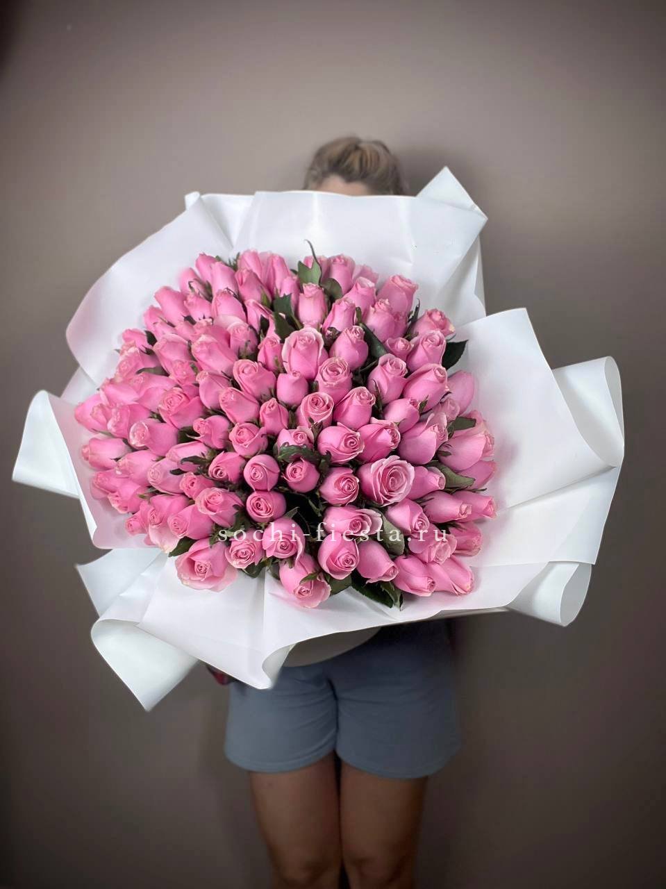 Сто одна белая роза собрана в впечатляющую охапку. Монохромная гамма и повторяющийся ритм бутонов создают мощное визуальное присутствие. Такой объём заполняет пространство и приковывает внимание.