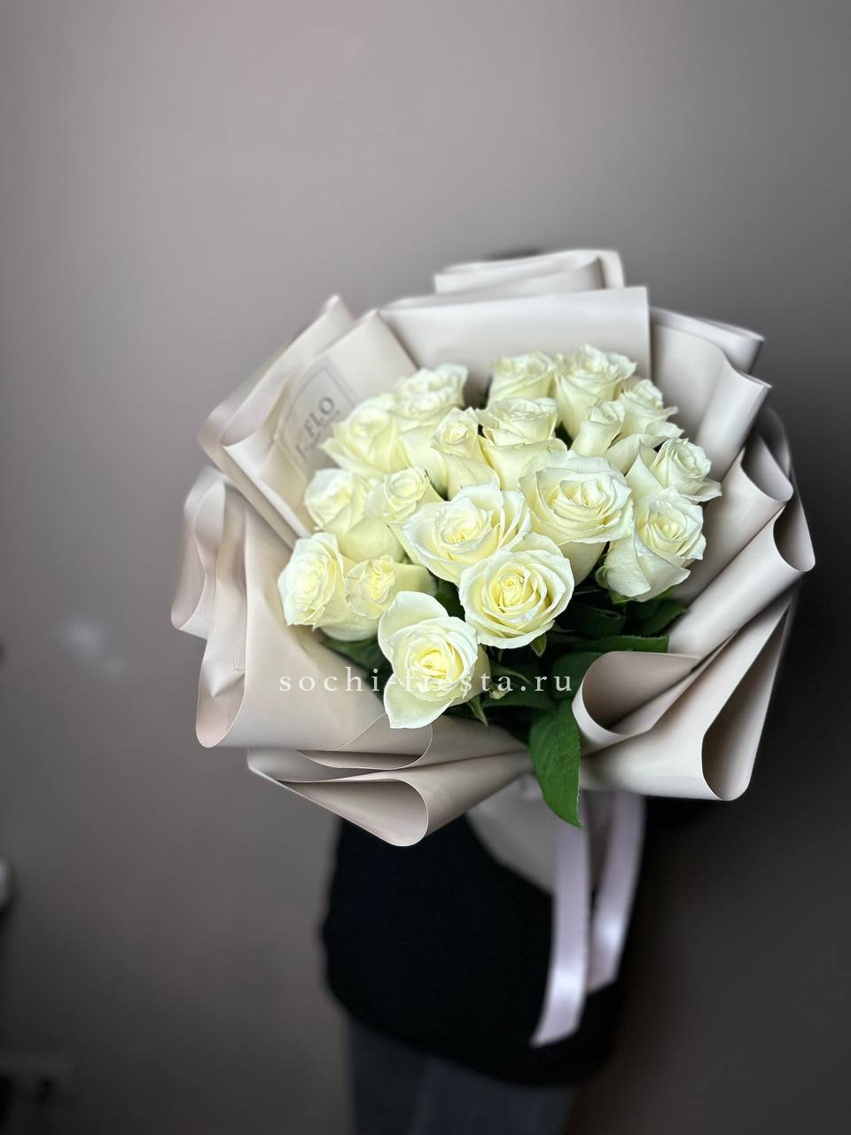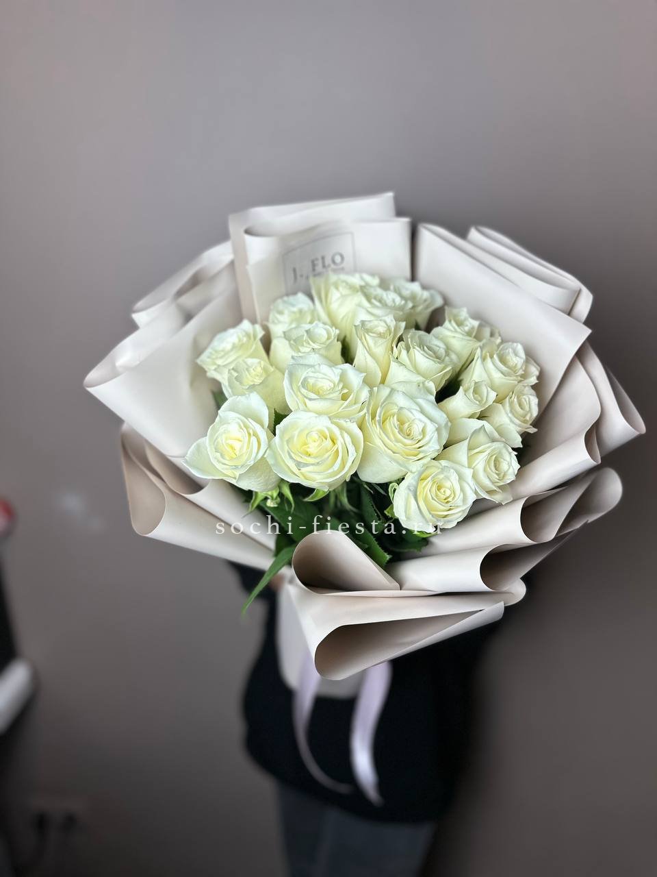 Девятнадцать белых роз в лаконичной крафтовой упаковке держат чёткий силуэт. Прямые стебли и плотные бутоны создают графичную композицию.
