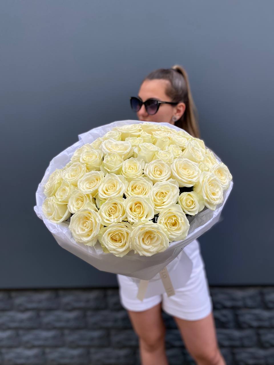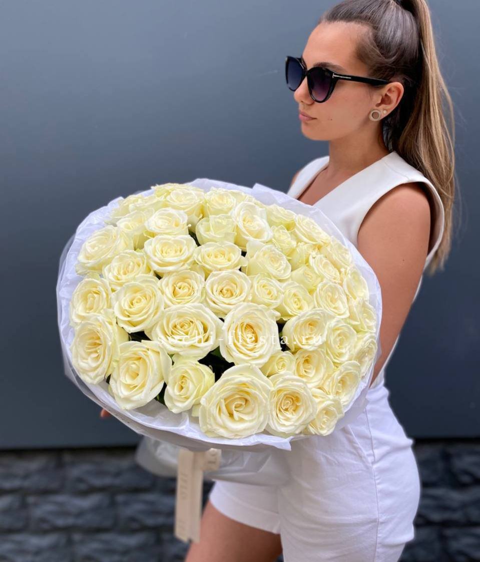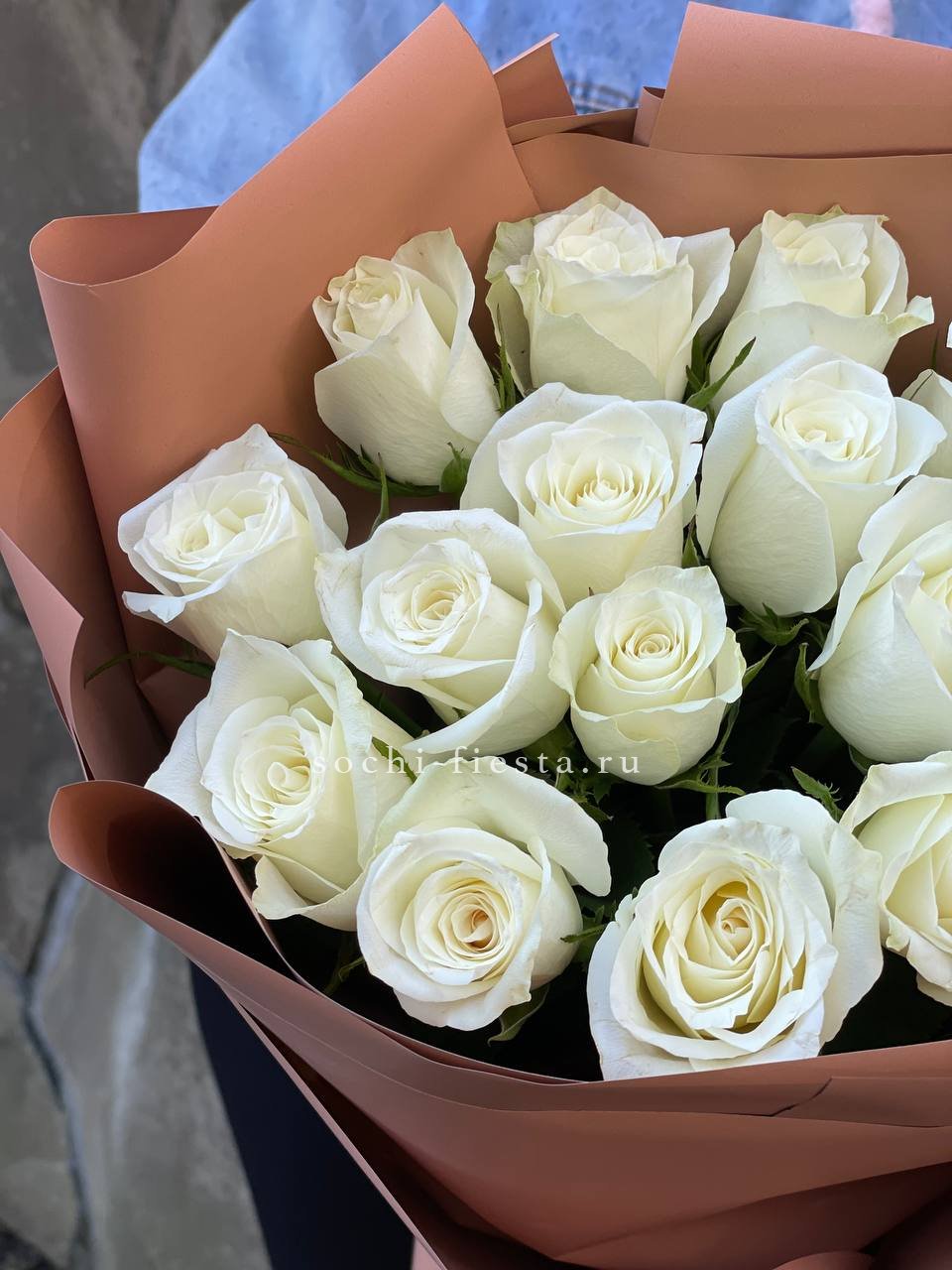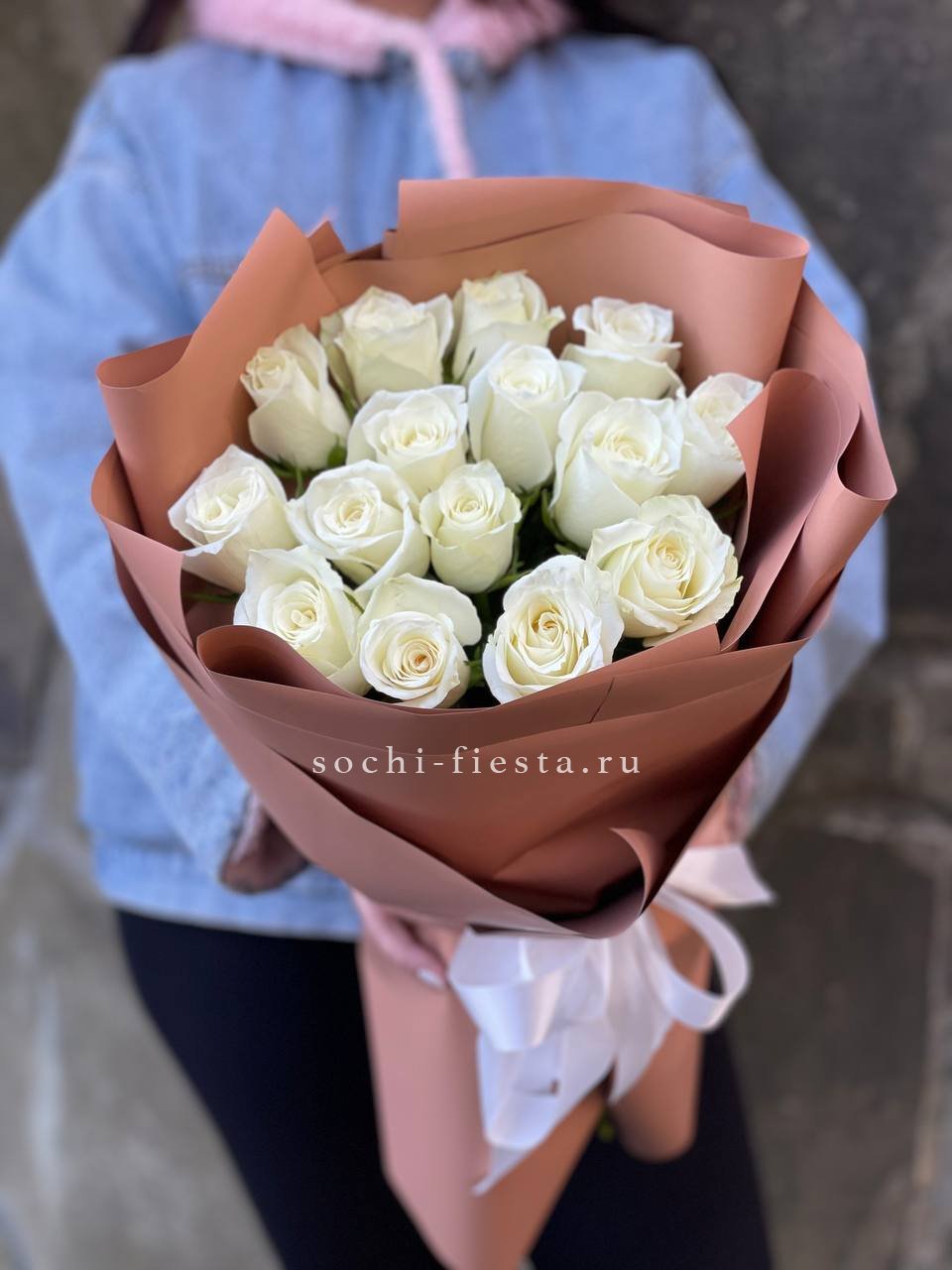 Пятнадцать белоснежных роз собраны в аккуратную форму с ровным силуэтом. Композиция сохраняет свежесть и держит структуру благодаря продуманному размещению бутонов в цилиндре.