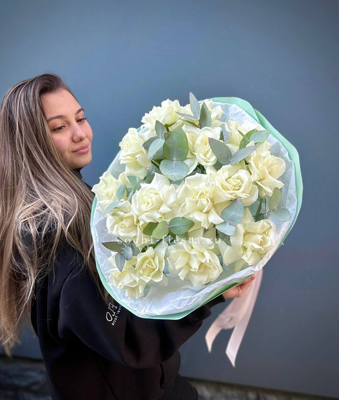 французские розы - 21 шт., эвкалипт - 2шт., лента, авторская упаковка.