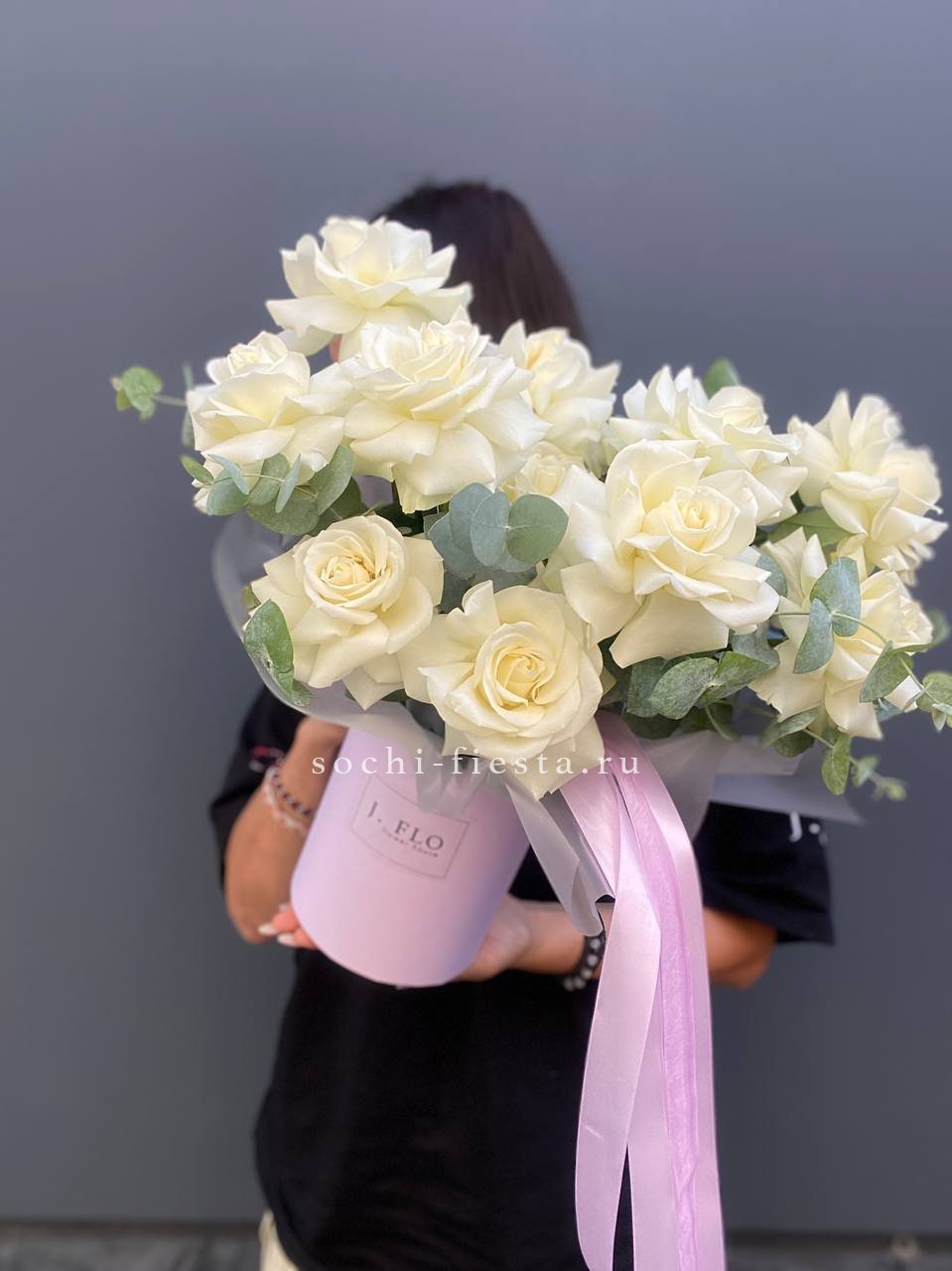 Французские розы раскрываются широко, создавая воздушный объем. Серебристые ветви эвкалипта добавляют глубину и легкость композиции. Свежий акцент для любого пространства.