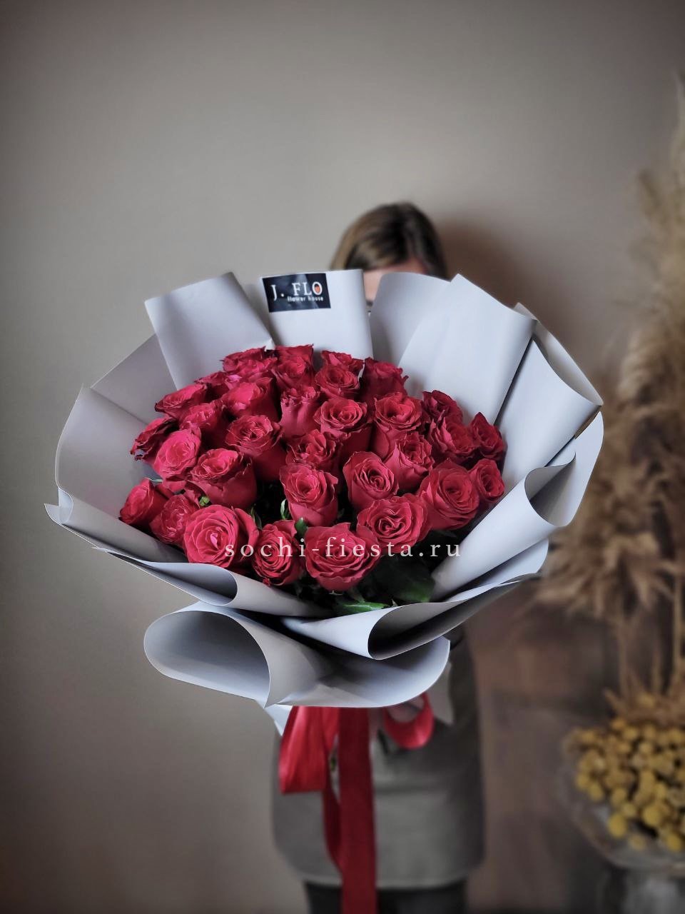 33 красных роз, лента, дизайнерская упаковка Вы можете выбрать желаемое количество цветов данном в букете.