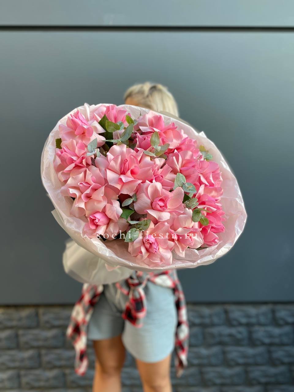 Семнадцать бутонов создают пышный объём и уверенное присутствие в любом пространстве. Розовый тон дополнен матовой зеленью эвкалипта. Букет держит форму и остаётся свежим долгое время.