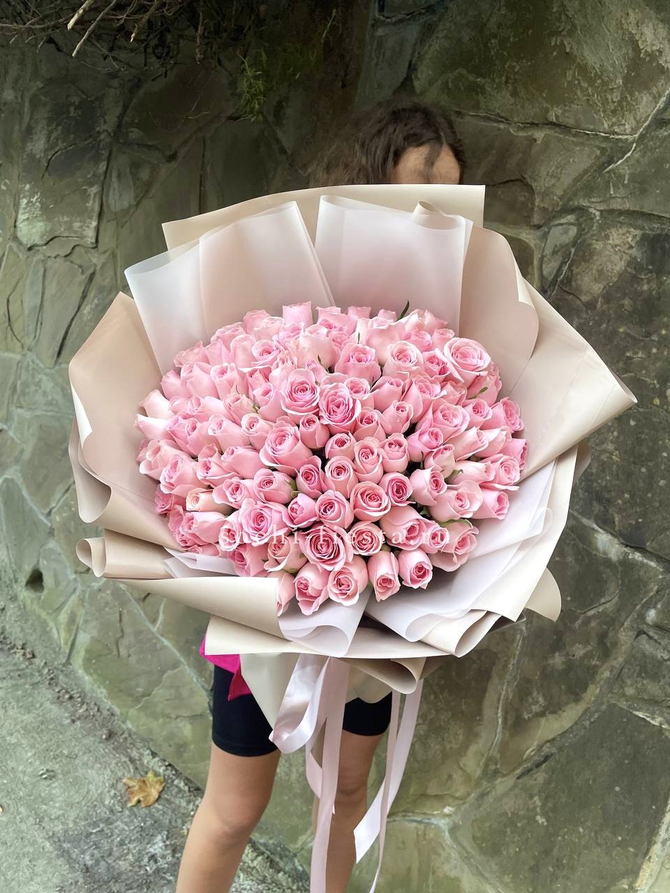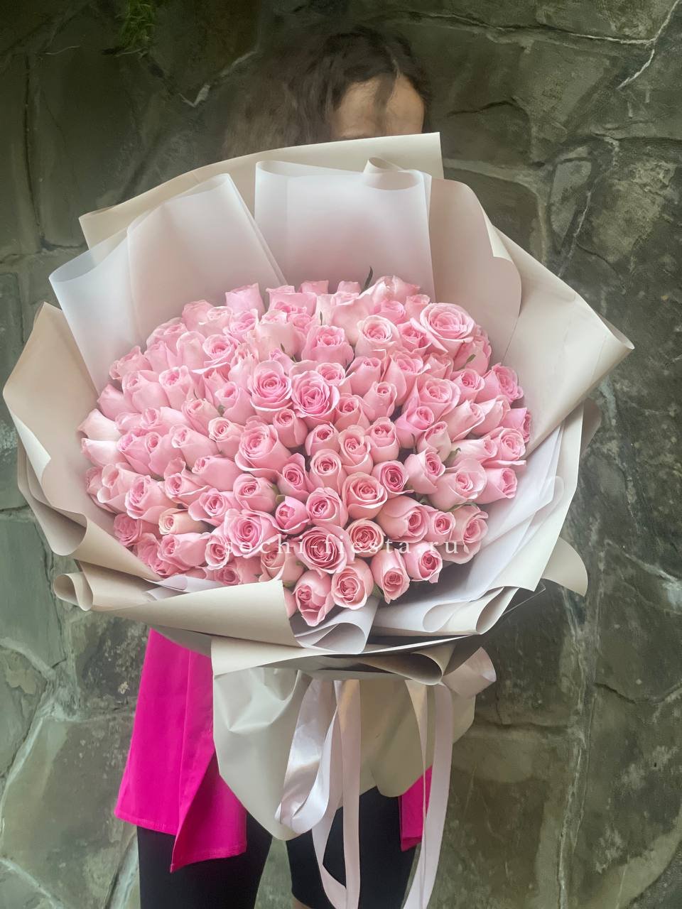 Тридцать пять стеблей формируют объемную композицию в розовой гамме. Букет занимает пространство уверенно и держит форму за счет плотной сборки. Классика, которая работает всегда.