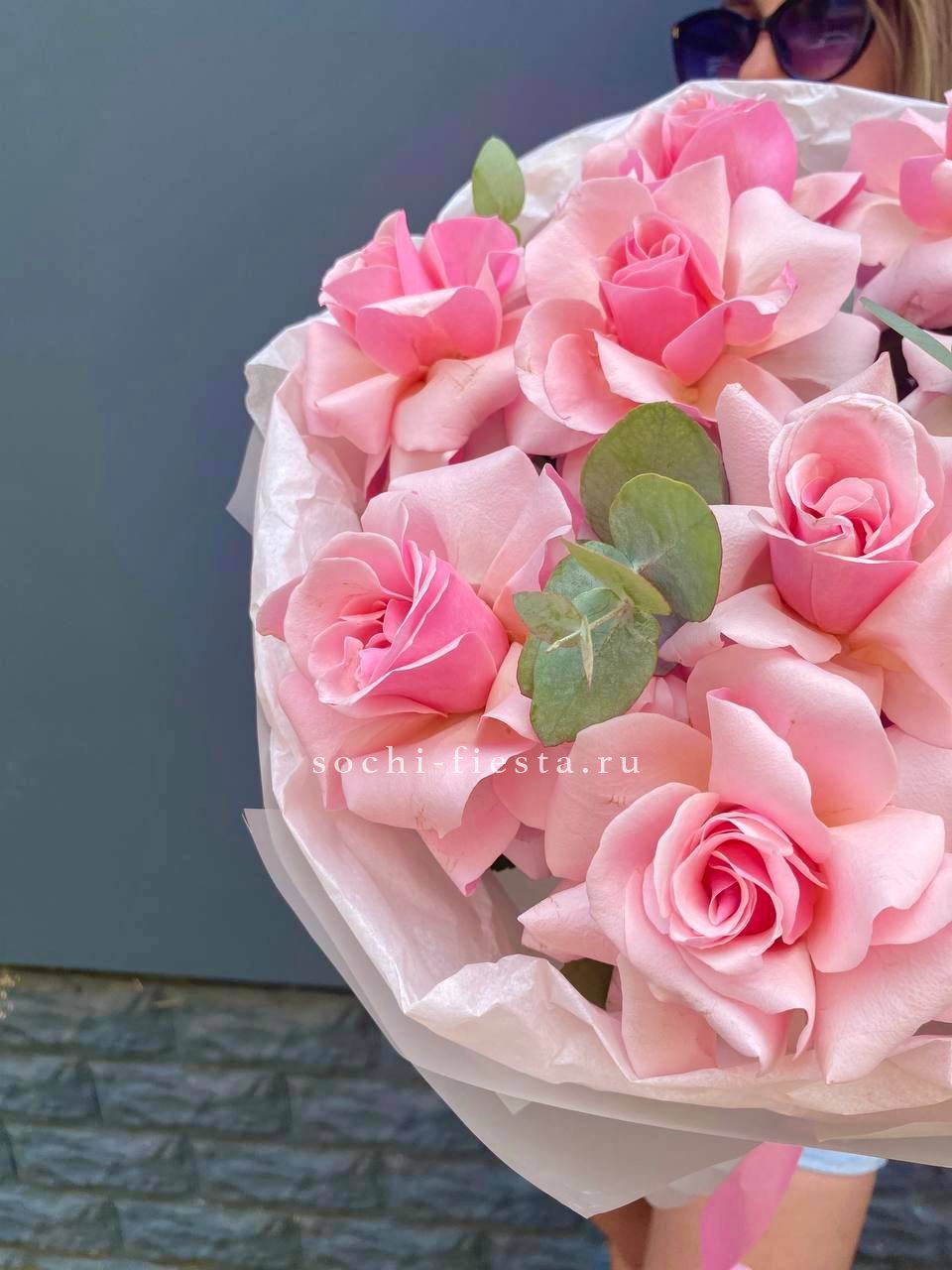 Одиннадцать вывернутых роз с открытой сердцевиной притягивают взгляд игрой света на лепестках. Авторская упаковка и веточка эвкалипта завершают композицию.