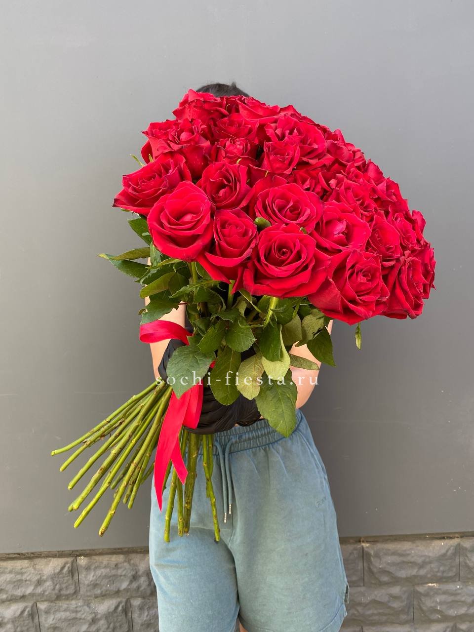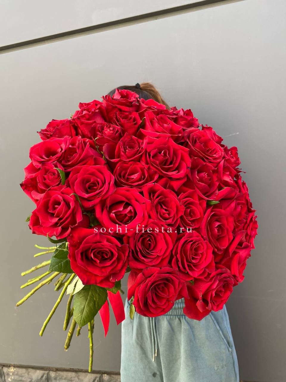 Плотная сборка из ста одной розы образует густую шапку бутонов глубокого красного цвета. Каждый цветок раскрывается постепенно, создавая живую фактуру и визуальную глубину композиции.