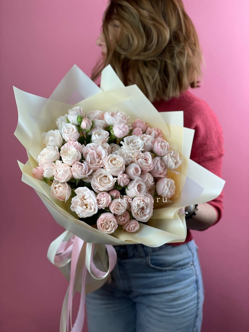 Сто один стебель кустовой розы собраны в плотный букет с множеством мелких бутонов. Каждая ветвь раскрывается пышной шапкой соцветий, создавая объёмную текстуру и живую динамику композиции.