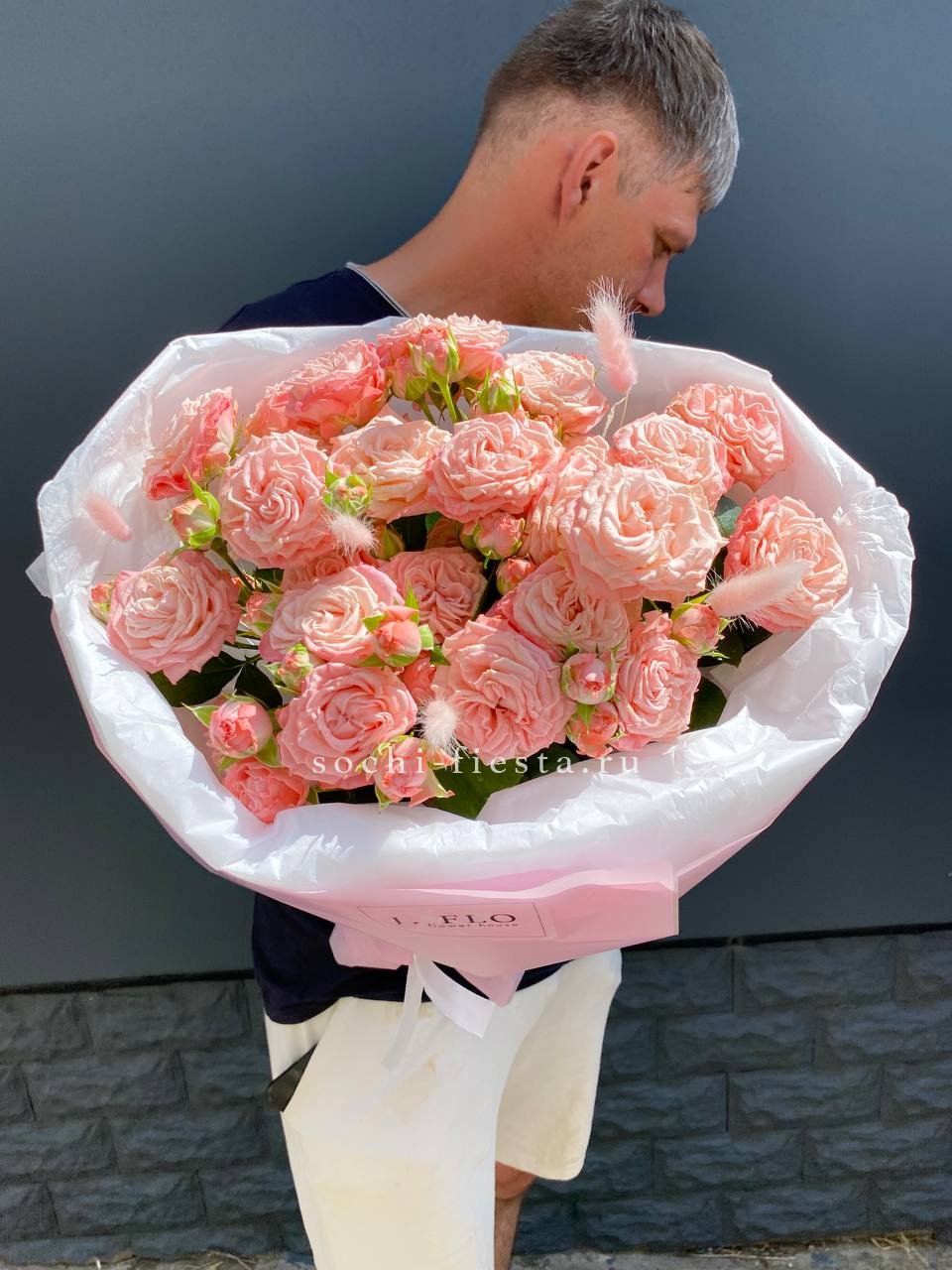 Кремовые кустовые розы сорта Мадам Бомбастик с пушистым лагурусом в дизайнерской упаковке. Многослойные бутоны создают воздушный силуэт. Мягкая пастельная гамма и природная фактура трав формируют спокойный образ.