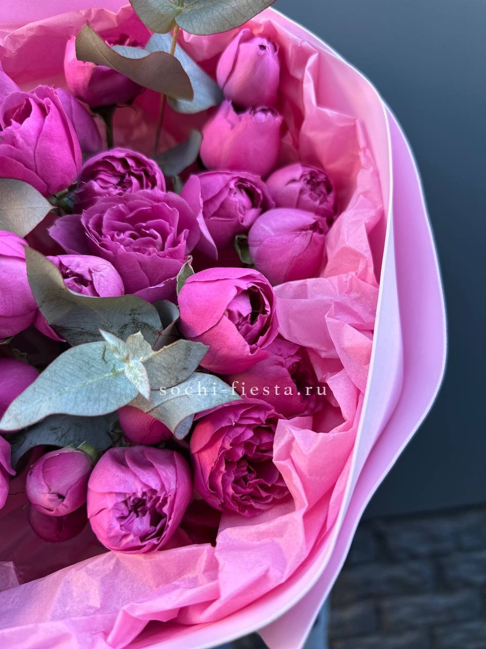 кустовая роза - 19 шт., эвкалипт, лента, дизайнерская упаковка.