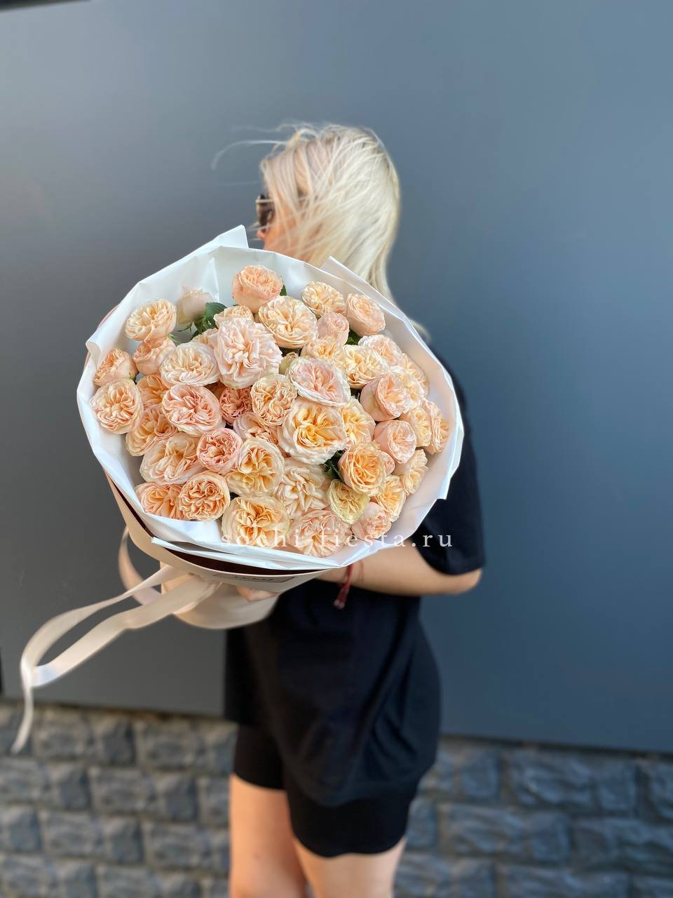 кустовая пионовидная роза, лента, дизайнерская упаковка.