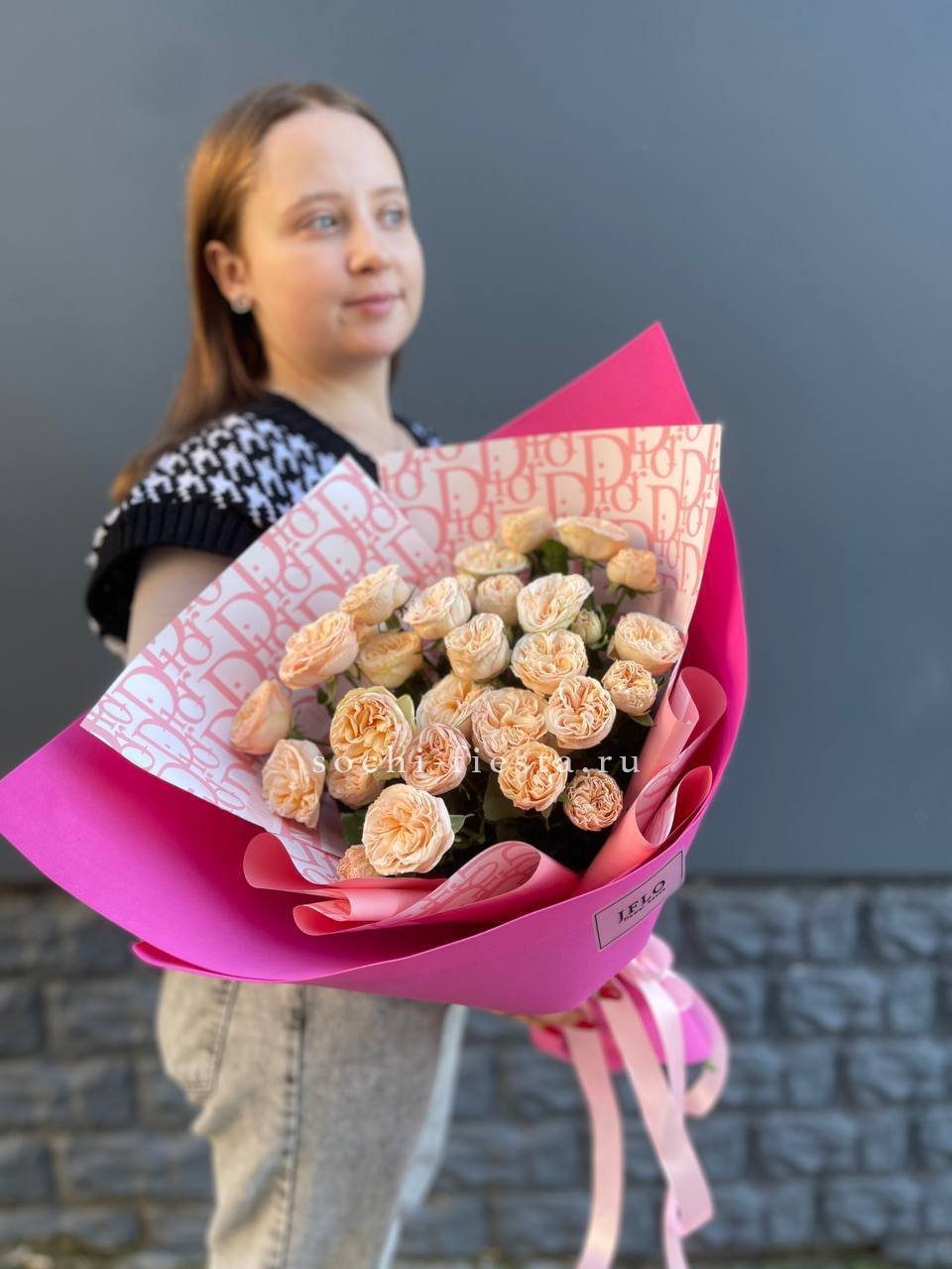Девять пышных бутонов с многослойными лепестками собраны в округлую композицию. Каждый цветок раскрывается постепенно, создавая объёмную текстуру и живую динамику. Букет выглядит самодостаточно и свежо в любом пространстве.