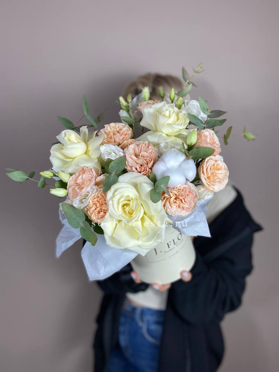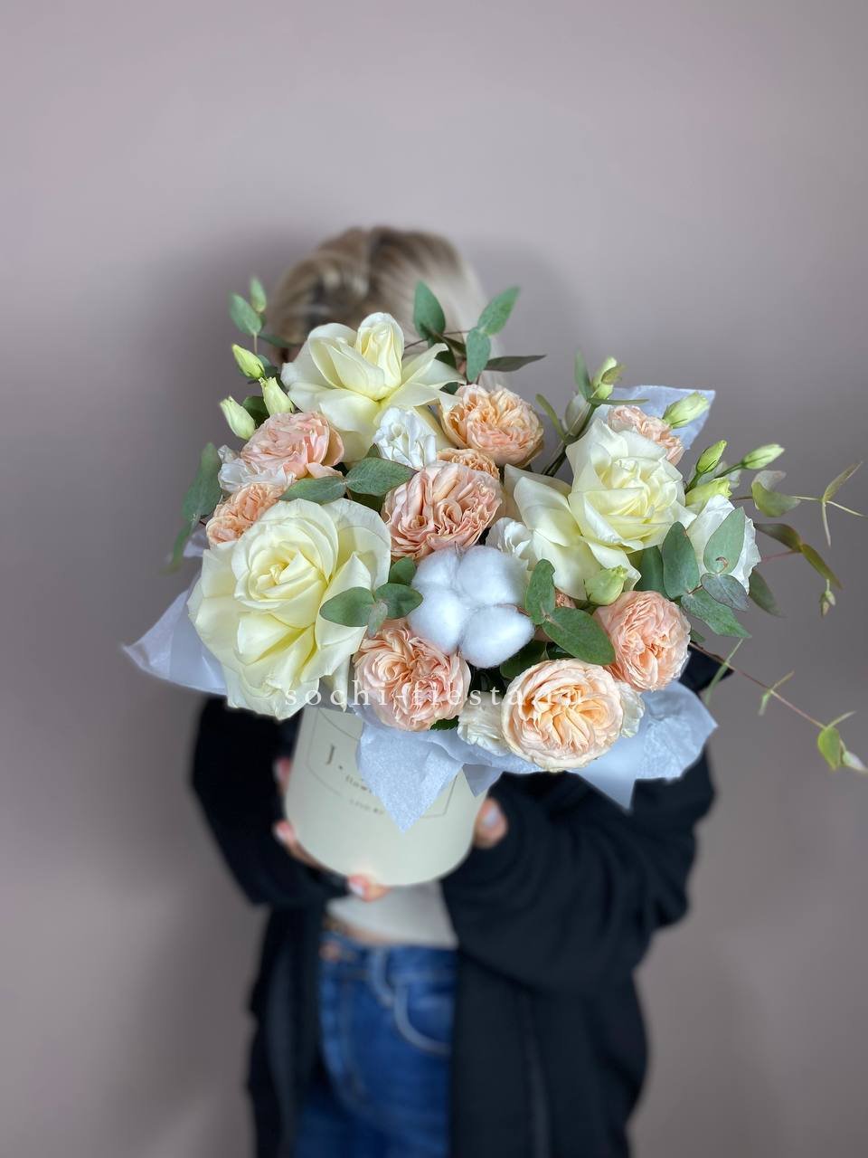 Кустовые розы сорта Джентл с пушистыми коробочками хлопка создают спокойную гармонию в компактной сумочке. Простая композиция для тех, кто любит естественность без лишних деталей.
