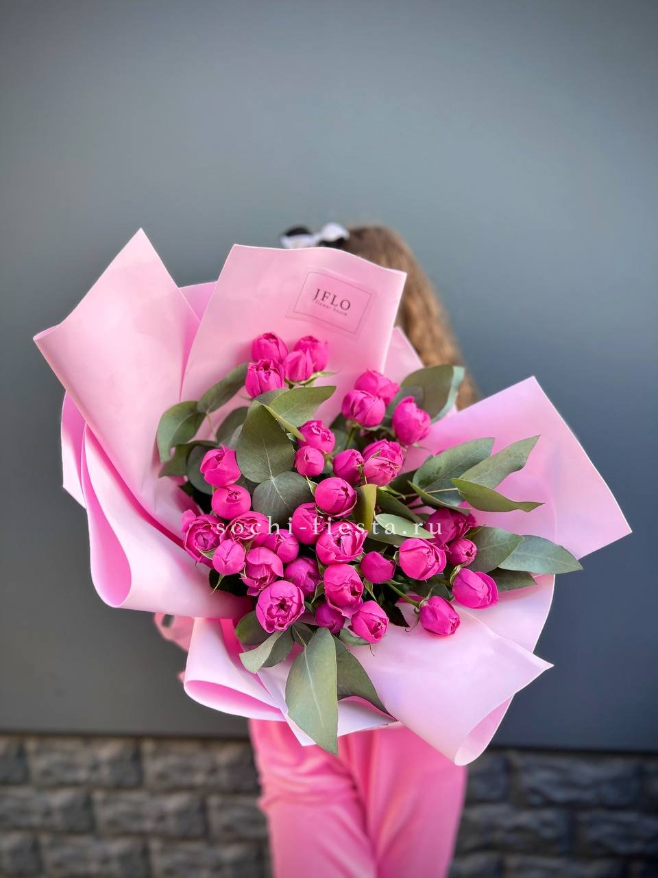 Лавандово-розовые лепестки создают ощущение утренней прохлады и свежести. Эвкалипт добавляет глубину, делая букет визуально насыщенным.
