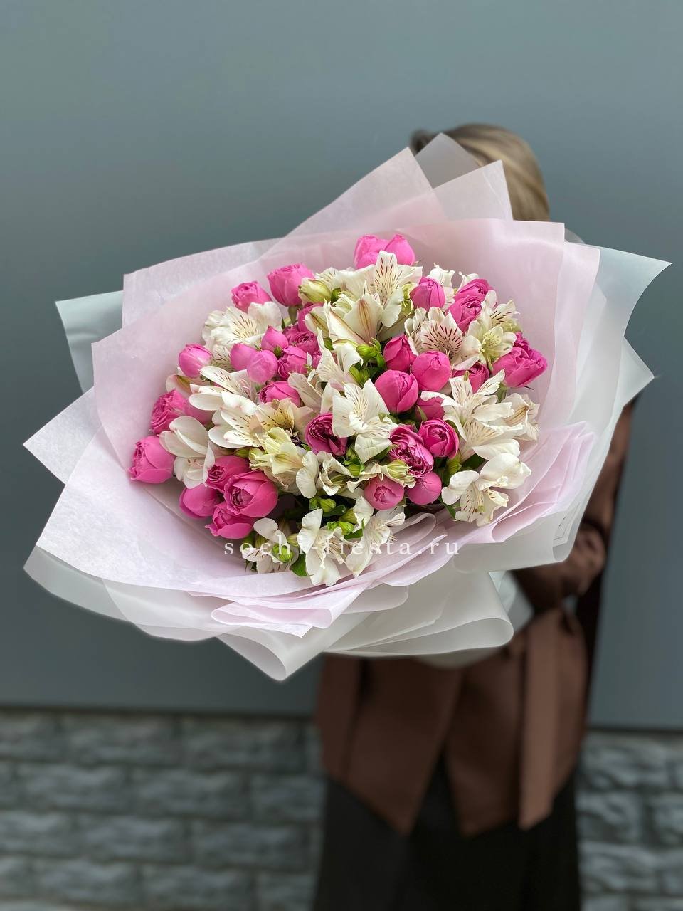 кустовые пионовидные розы, альстромерии, тишью, пленка и лента.