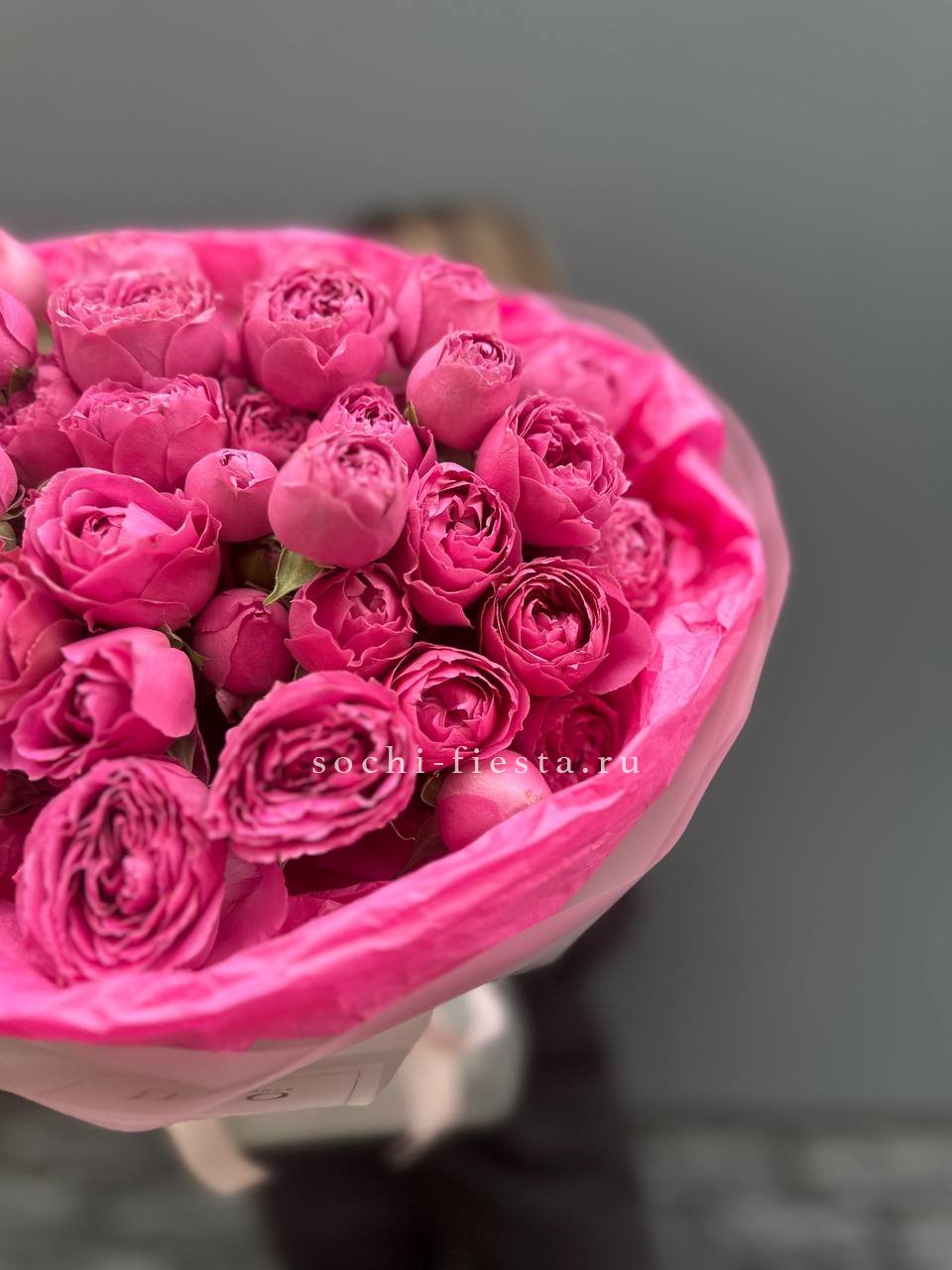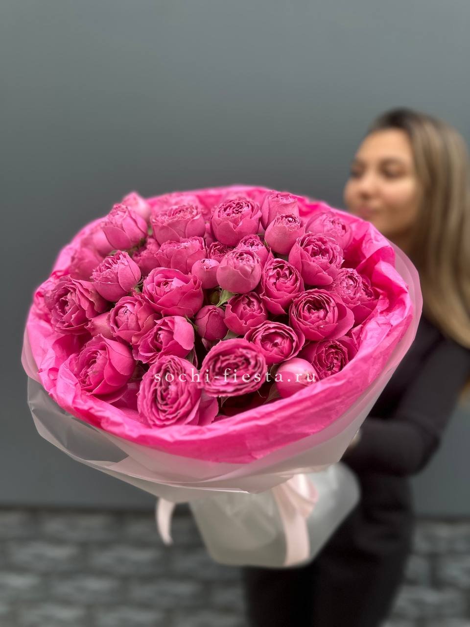 розы пионовидные 15 шт, эвкалипт, пленка, лента.