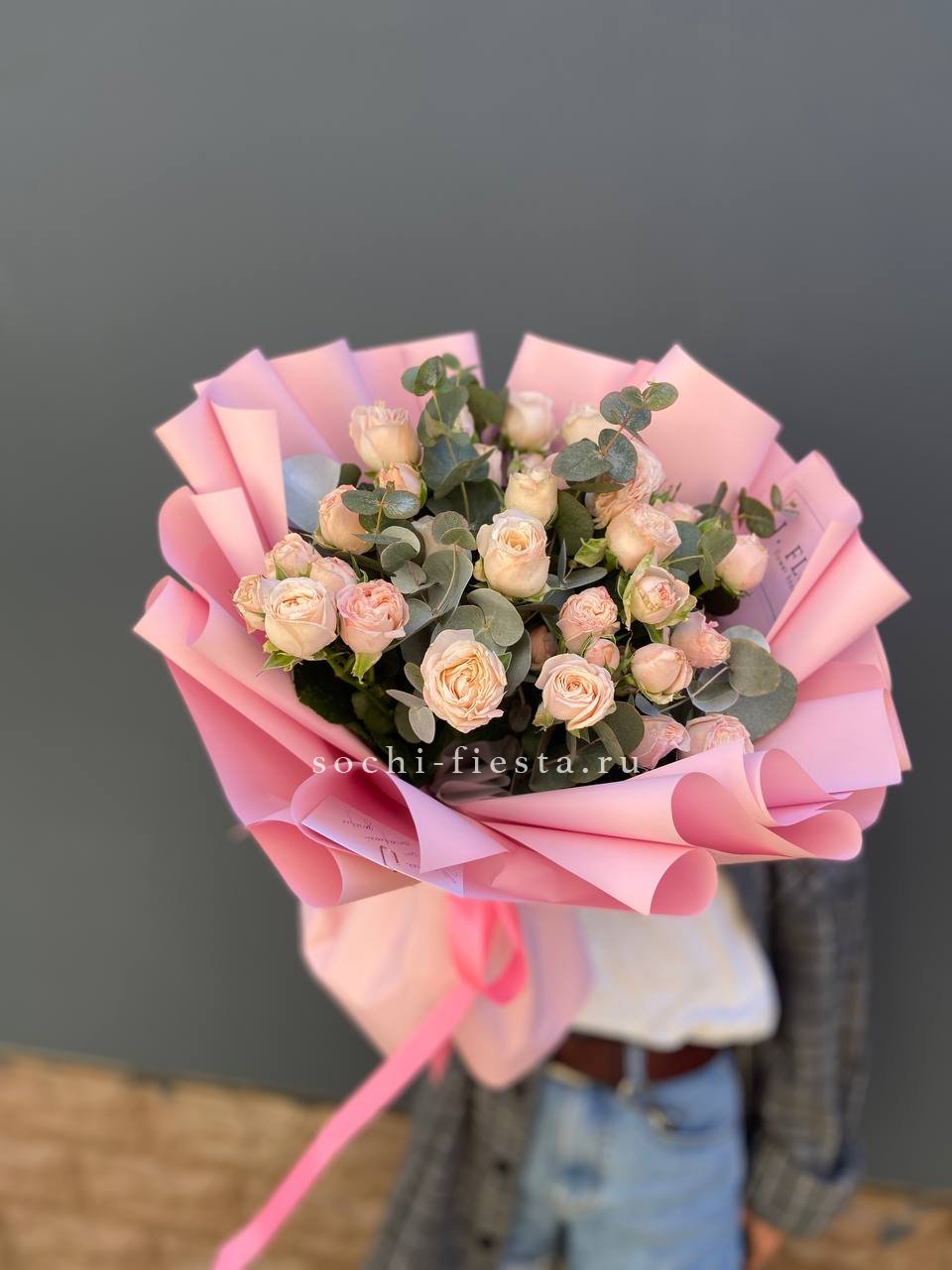 Двадцать пять пионовидных роз в плотной округлой форме создают объёмное облако нежно-розового оттенка. Сорт Pink X-Pression с густомахровыми бутонами собран под ленту без дополнительного декора.
