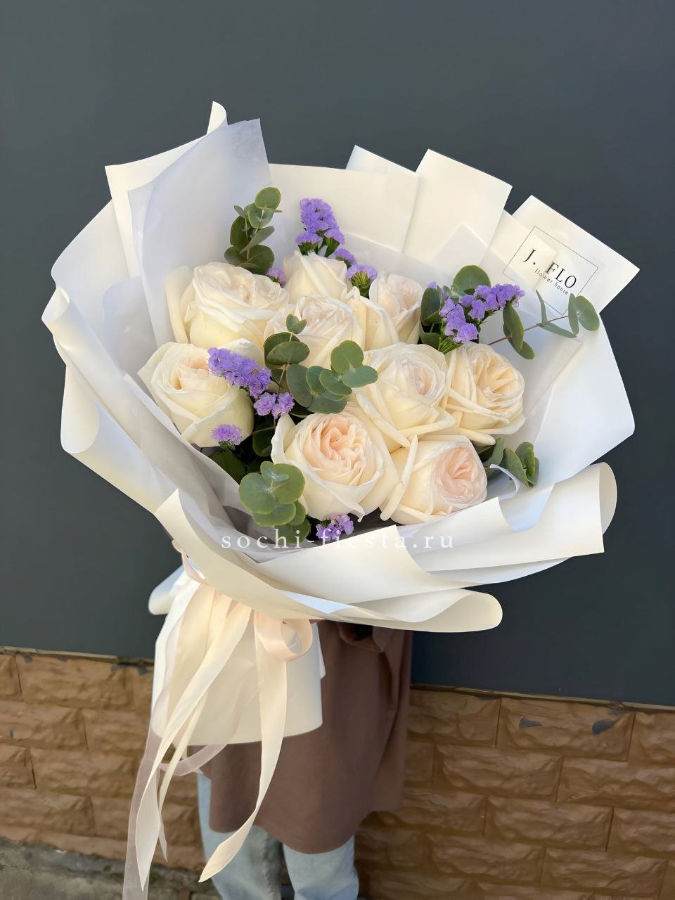 Девять белых роз White O'Hara дополнены статицей и эвкалиптом для воздушности. Многослойные лепестки раскрываются постепенно, создавая глубину и объем в компактной форме.