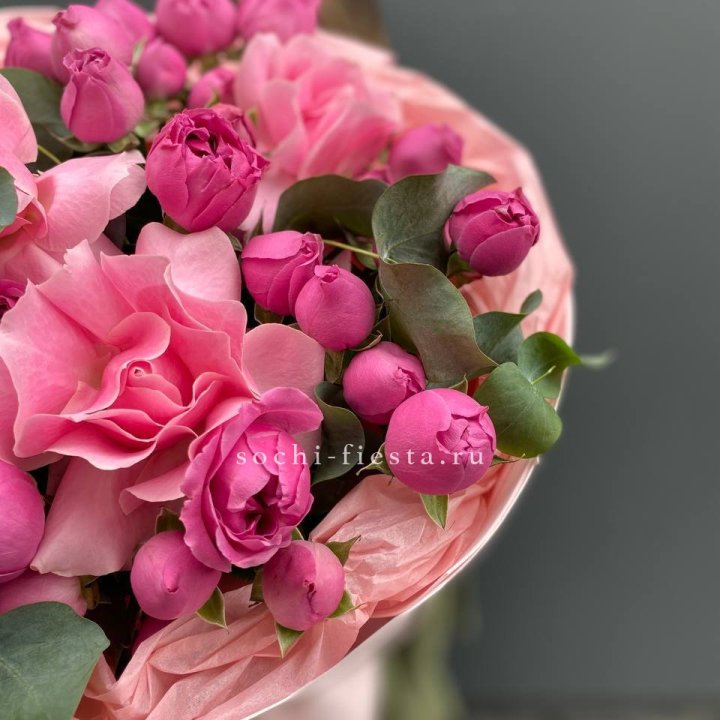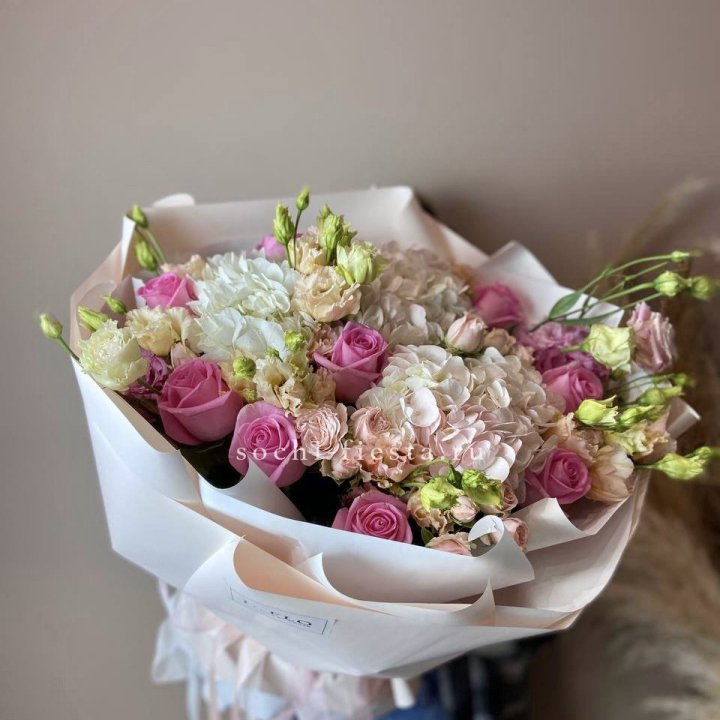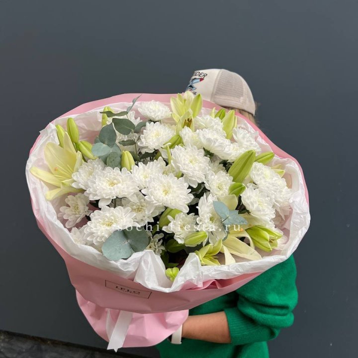 Зима и лето в Симферополи — розы и хризантемы как основа. Эти виды стабильны в поставках круглый год. Флорист дополняет их сезонными акцентами: хвойные ветви зимой, открытая эустома летом. Сборный букет в любое время года выглядит живым и актуальным.
