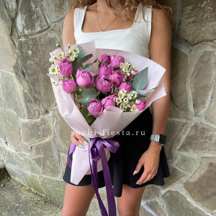 Основа сборных букетов в Симферополи: розы (Freedom, Mondial, Avalanche), хризантема кустовая, альстромерия, эустома, фрезия, вероника. Дополнительно — ранункулюсы в сезон, хризантема одиночная, ирис весной, тюльпаны в апреле. Состав зависит от текущей поставки и сезона. Флорист всегда предлагает то, что в лучшей форме прямо сейчас.