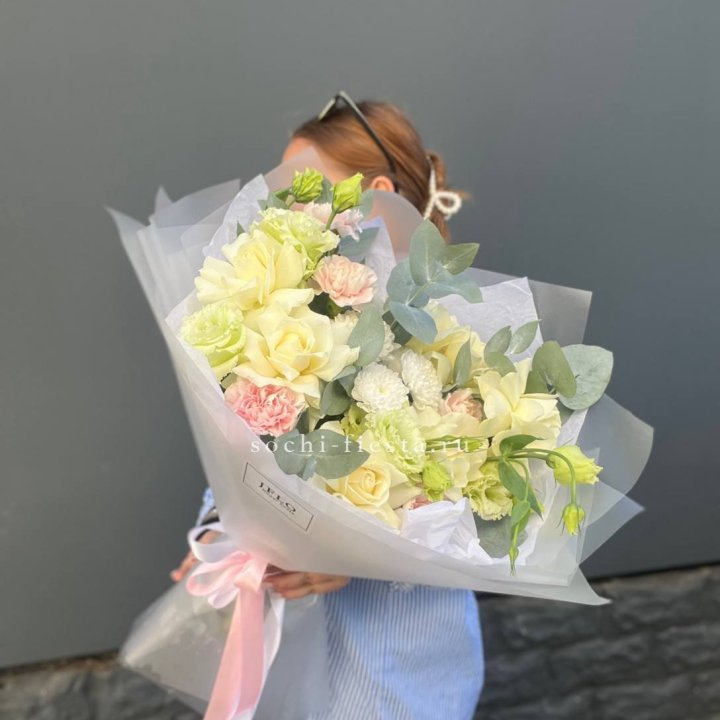 Основа сборных букетов в Симферополи: розы (Freedom, Mondial, Avalanche), хризантема кустовая, альстромерия, эустома, фрезия, вероника. Дополнительно — ранункулюсы в сезон, хризантема одиночная, ирис весной, тюльпаны в апреле. Состав зависит от текущей поставки и сезона. Флорист всегда предлагает то, что в лучшей форме прямо сейчас.