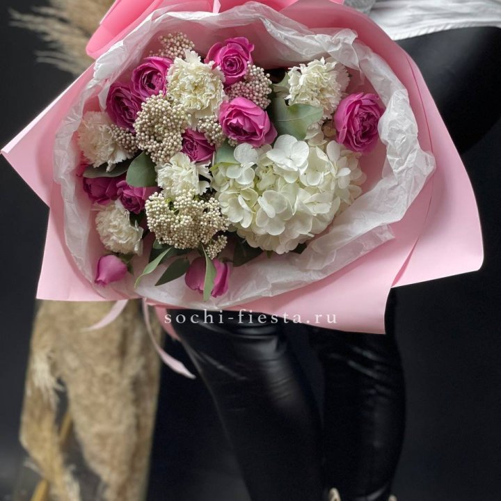 Зима и лето в Симферополи — розы и хризантемы как основа. Эти виды стабильны в поставках круглый год. Флорист дополняет их сезонными акцентами: хвойные ветви зимой, открытая эустома летом. Сборный букет в любое время года выглядит живым и актуальным.