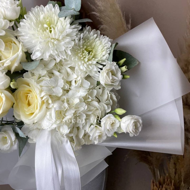 Зима и лето в Симферополи — розы и хризантемы как основа. Эти виды стабильны в поставках круглый год. Флорист дополняет их сезонными акцентами: хвойные ветви зимой, открытая эустома летом. Сборный букет в любое время года выглядит живым и актуальным.