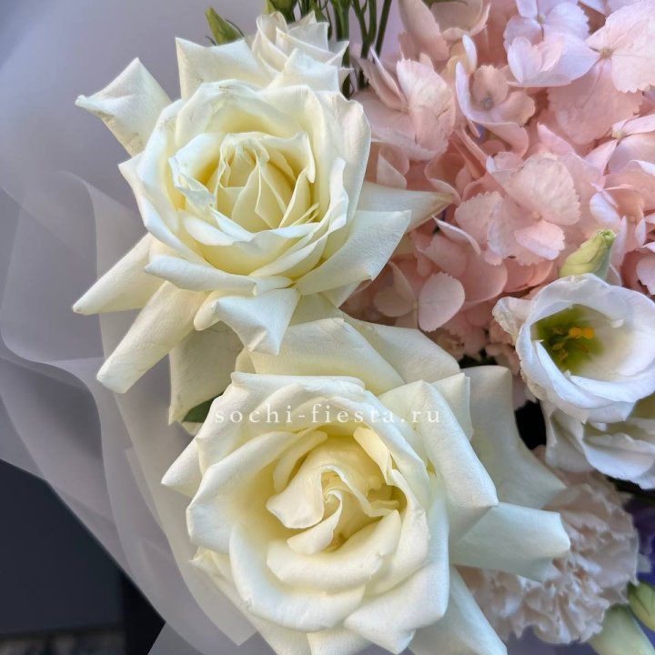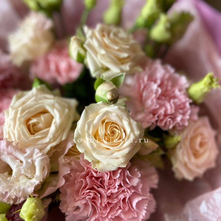Основа сборных букетов в Симферополи: розы (Freedom, Mondial, Avalanche), хризантема кустовая, альстромерия, эустома, фрезия, вероника. Дополнительно — ранункулюсы в сезон, хризантема одиночная, ирис весной, тюльпаны в апреле. Состав зависит от текущей поставки и сезона. Флорист всегда предлагает то, что в лучшей форме прямо сейчас.