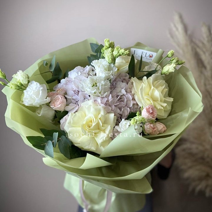 Зима и лето в Симферополи — розы и хризантемы как основа. Эти виды стабильны в поставках круглый год. Флорист дополняет их сезонными акцентами: хвойные ветви зимой, открытая эустома летом. Сборный букет в любое время года выглядит живым и актуальным.