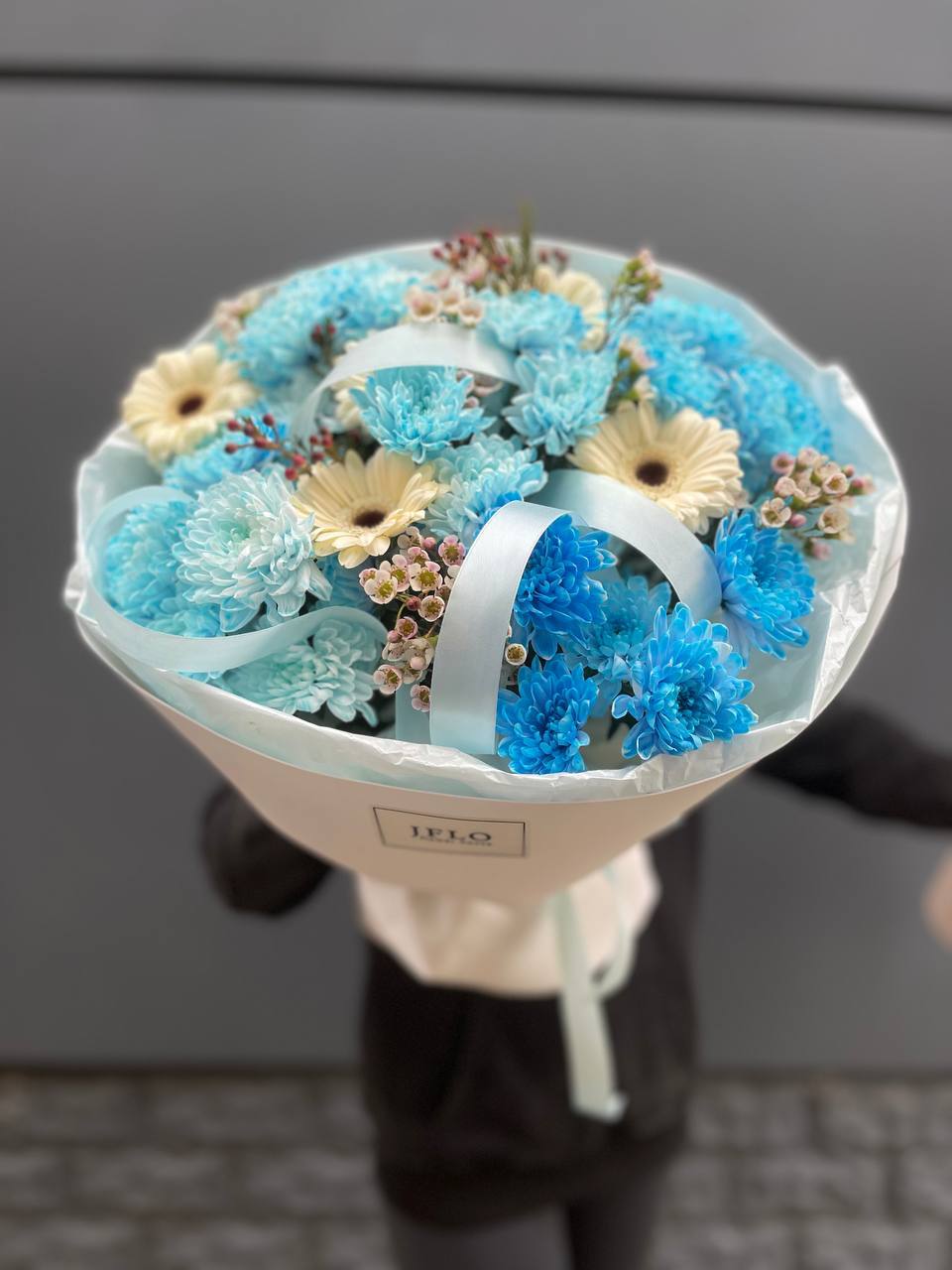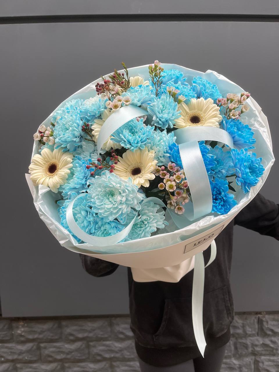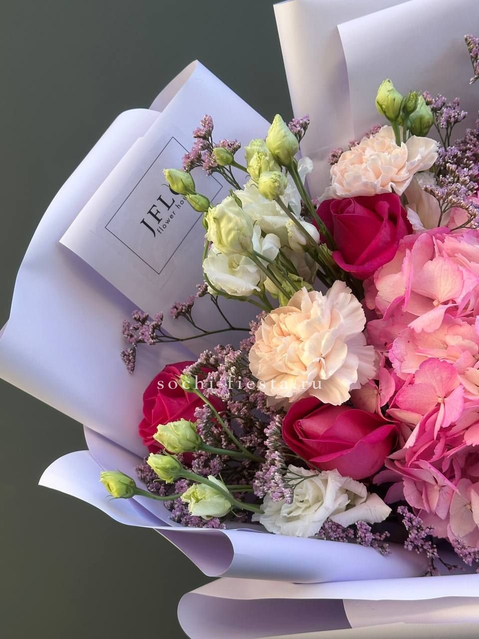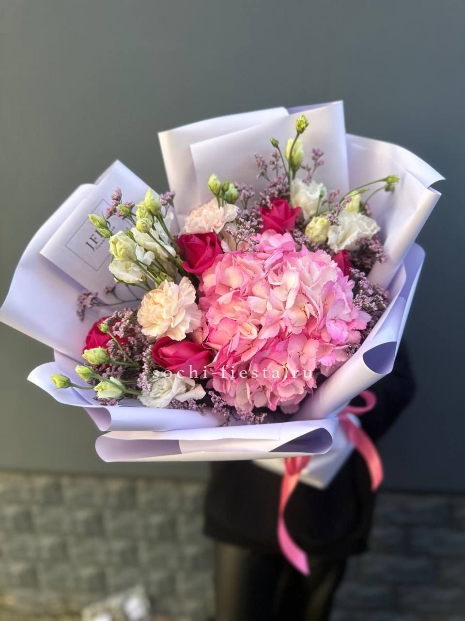 гортензия, эустома, кустовая роза, диантус, лента, упаковка Состав букета в несозон может нести незначительные изменения.