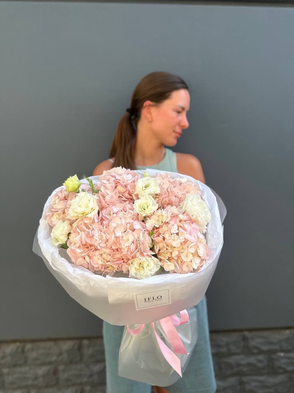 гортензия, герберы, эустомы, розы, диантус, эвкалипт, лента, дизайнерская упаковка.