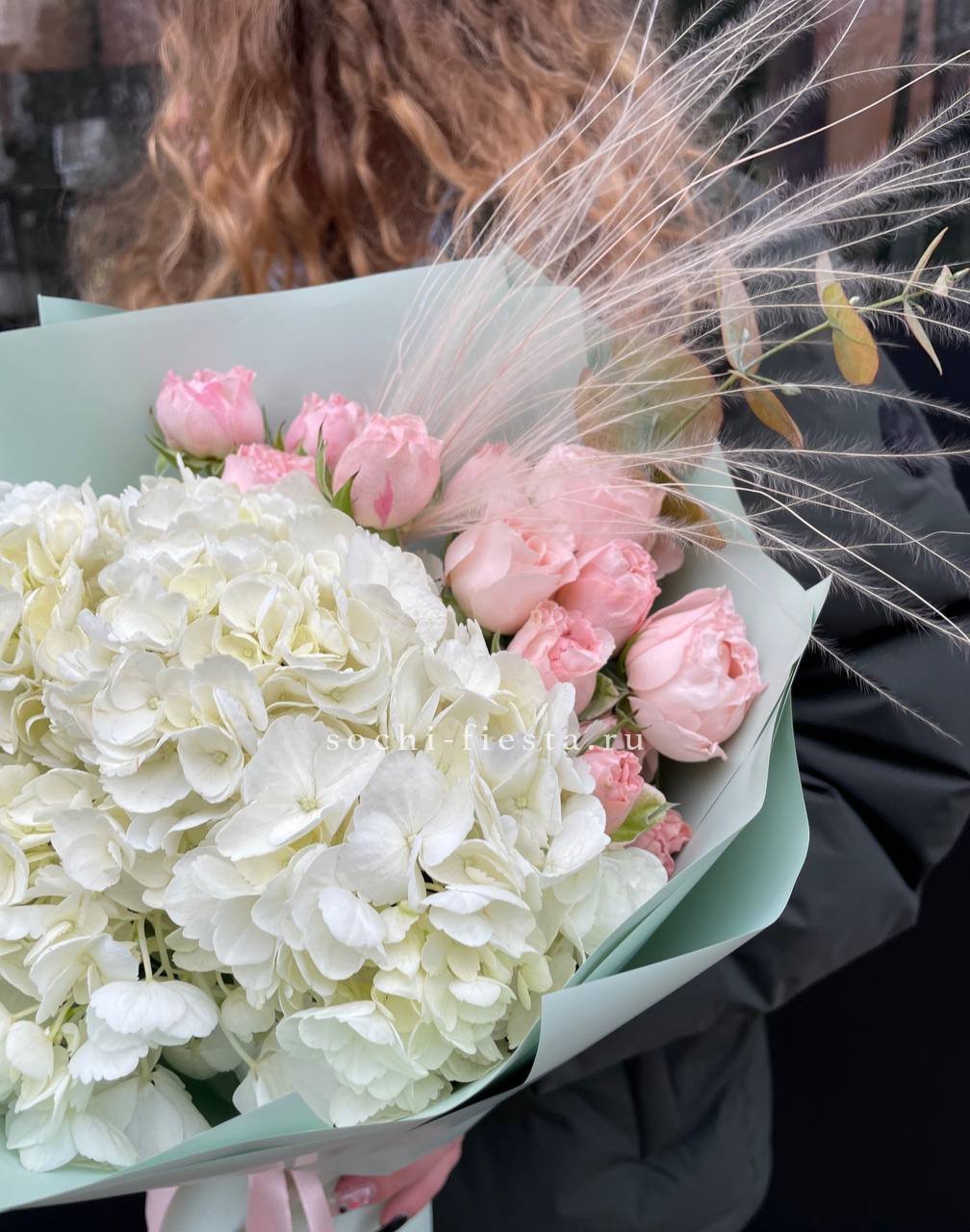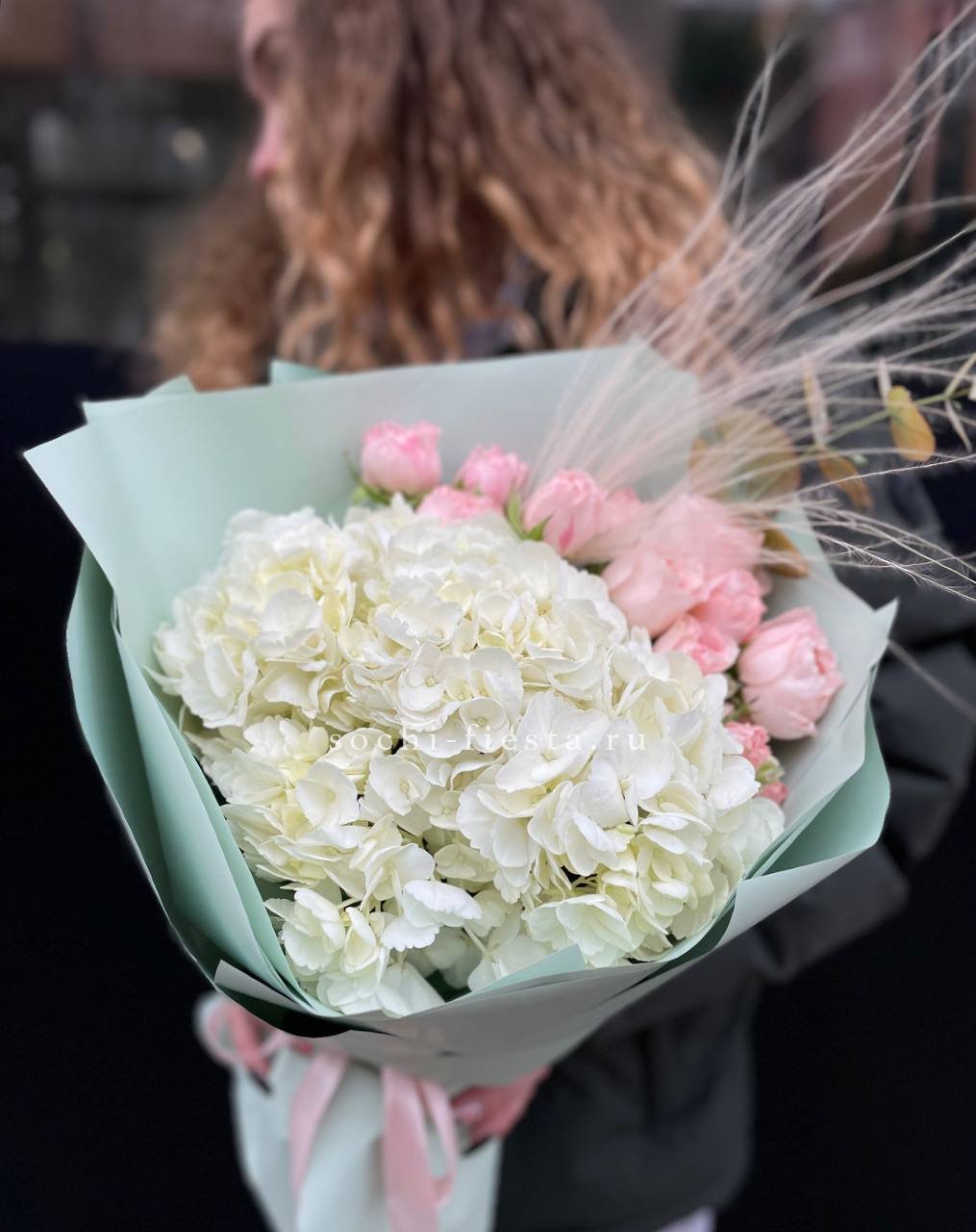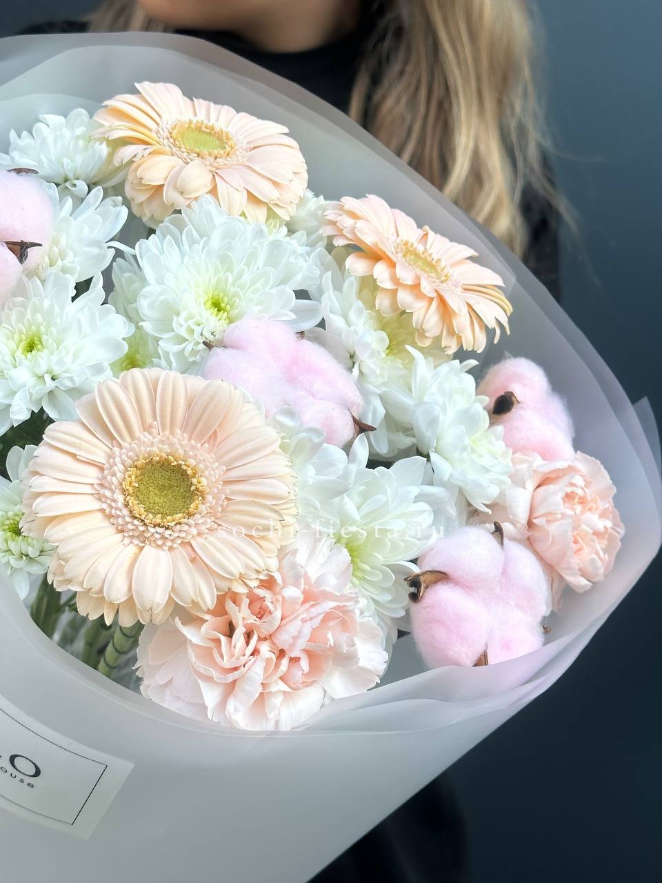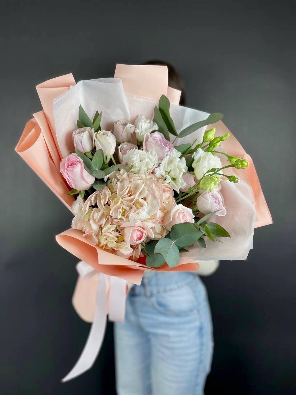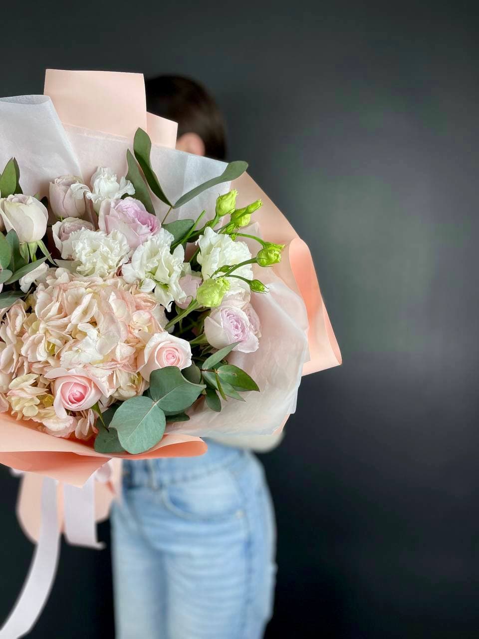 Плотная сборка с пышными соцветиями гортензии и яркими герберами создает объемный силуэт. Маттиола и лимониум добавляют воздушности по краям, а диантусы заполняют центр мягкими переходами.